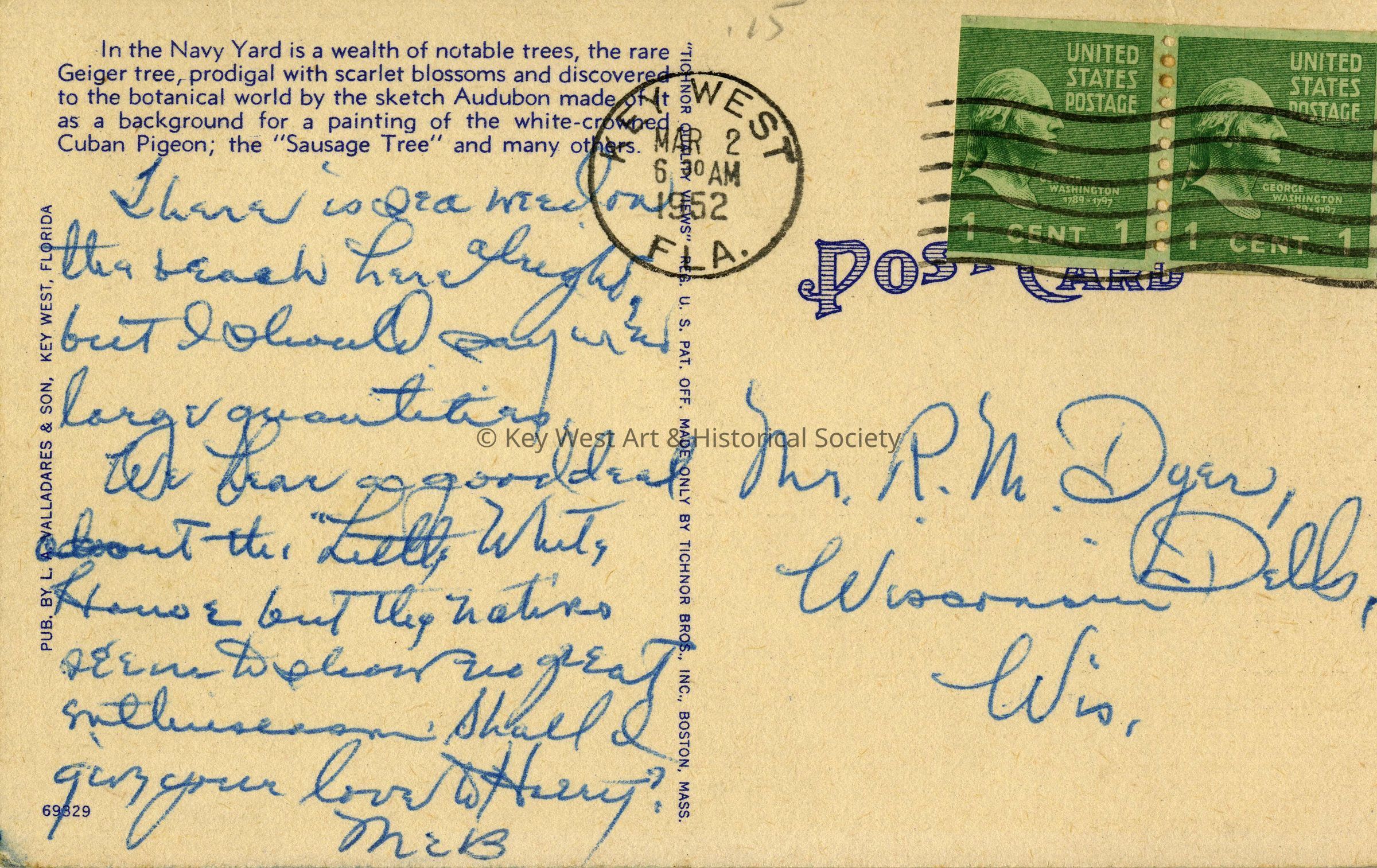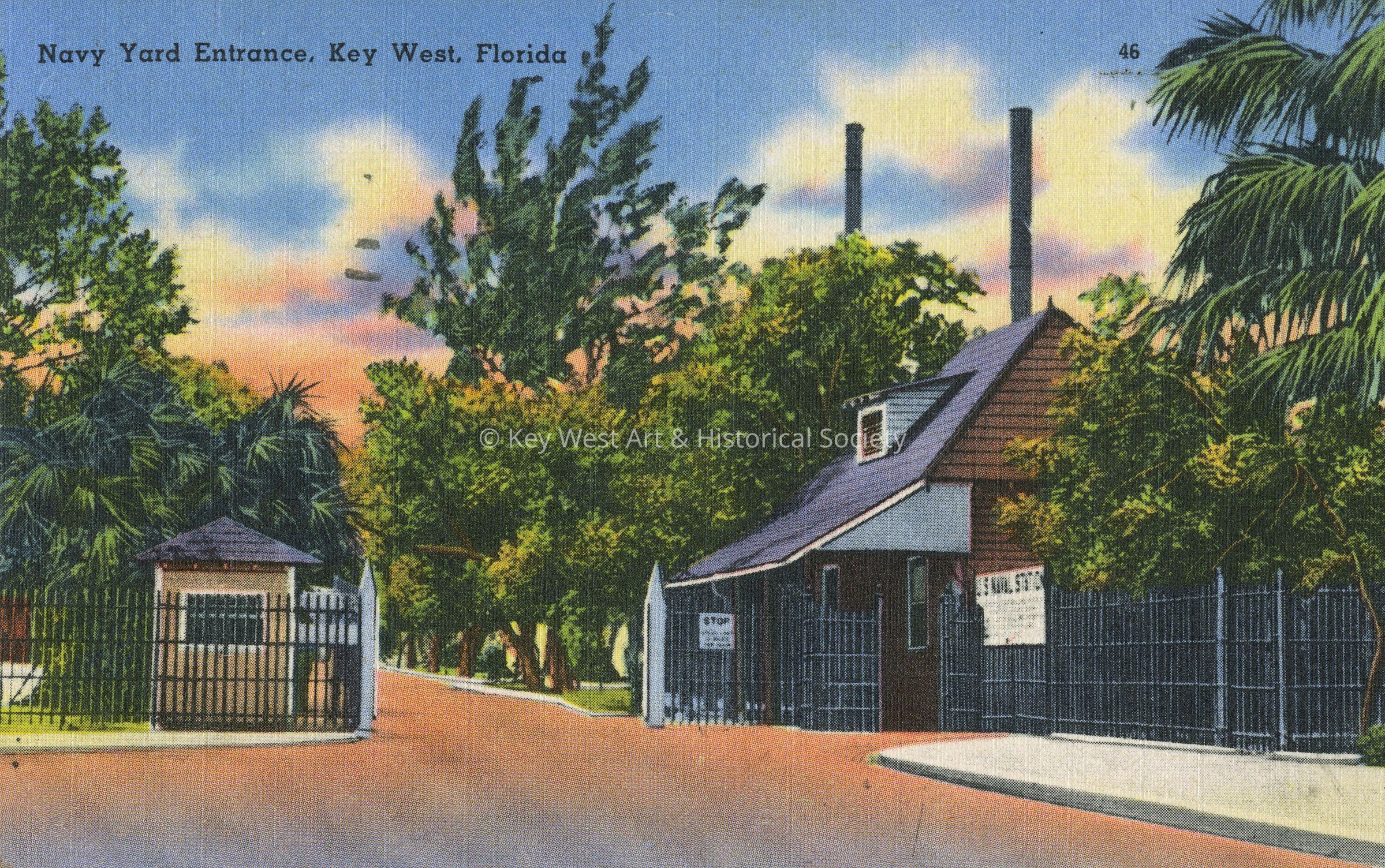 Linen postcard depicting the entrance to the U.S. Naval Station. The caption reads, ‘Navy Yard Entrance, Key West, Florida'. The description on the verso reads, 'In the Navy Yard at Key West there is a wealth of notable trees, the rare Geiger tree, prodigal with scarlet blossoms and discovered by the sketch Audubon made of it as a background for a painting of the white-crowned Cuban Pigeon; the sausage tree, and many others.'Subject Place