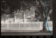 Negative showing a wooden fence and the front porch of a house; there is a tree in front of the fence. House is located at 1108 Southard St; belonging to Nancy Friday. Accession # 2005.21.0001Collection