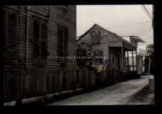 Negative looking down a lane showing partial view of three houses. The first house is a side view of a wooden house only the first floor is visible. The second house is a 2 story eyebrow house. The third house is a 2 story wood house with a porch on the second floor. Locations unknown. Accession # 2005.21.0001.Collection