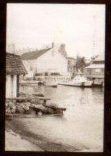 Negative showing the waterfront, a coast guard can be seen in the water. The Custom House can be seen in the background. Accession #2005.21.0001.Collection