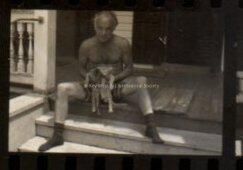 Negative showing a man sitting on steps with a cat. Accession # 2005.21.0001.Collection