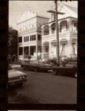 Negative taken from the street showing 2 houses. The first house is a three story wooden house. The second house is a two story with a gingerbead design on the porch . Location unknown. Accession # 2005.21.0001. 8 x 10 available.Collection