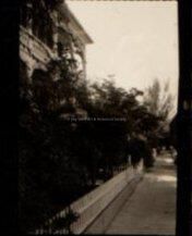 Negative taken from the sidewalk showing a partial view of a wooden fence and a 2 story house with trees in front of it. Accession # 2005.21.0001.Collection