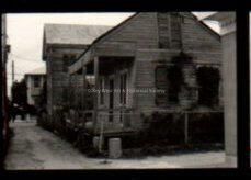 Negative looking down a lane showing 3 houses. The first house is a wood 2 story eyebrow house. The second house is a 2 story wood house. The thirst is across the street from the second and is a 2 story bay house. Locations unknown. Accession # 2005.21.0001.Collection