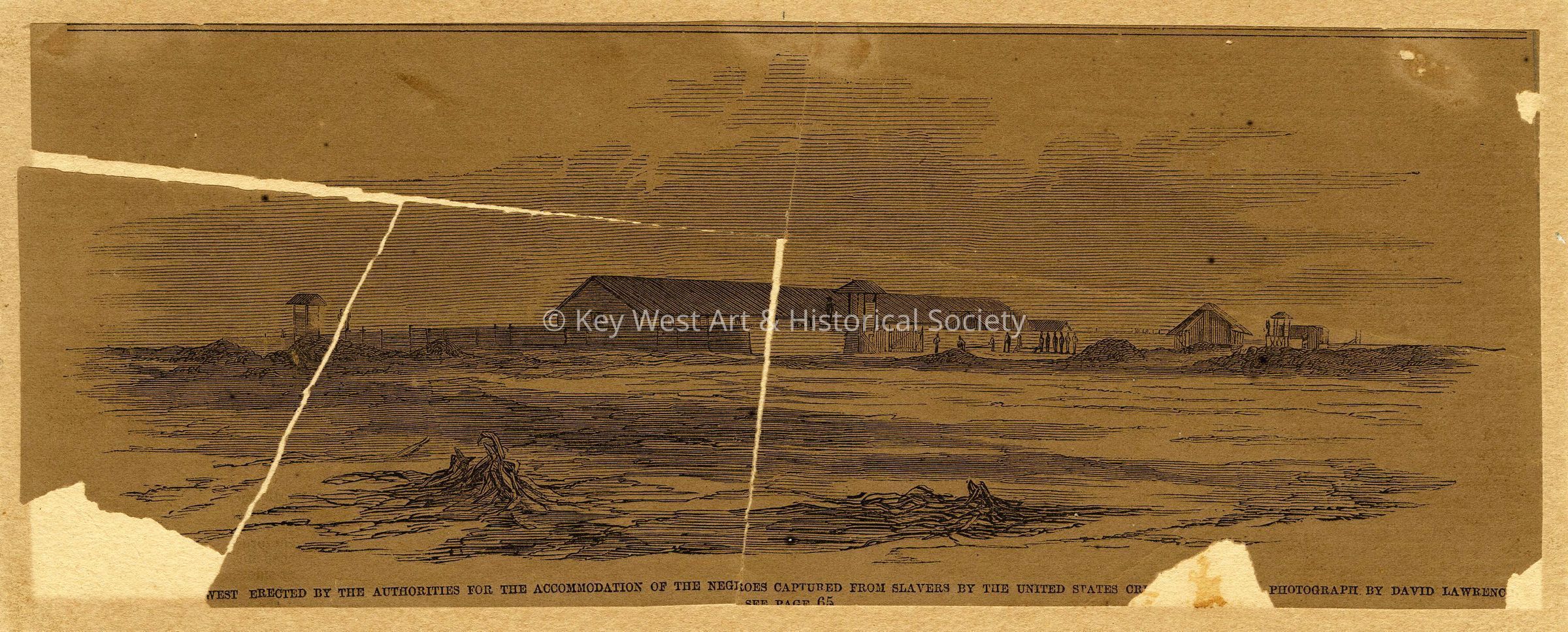 Lithograph clipping from Frank Leslie's Illustrated Newspaper dated June 23, 1860. Illustration depicts the buildings erected by authorities for the accommodation of the Negroes captured from slavers by the United States cruisers. The lithograph was produced from a photograph by David Lawrence.