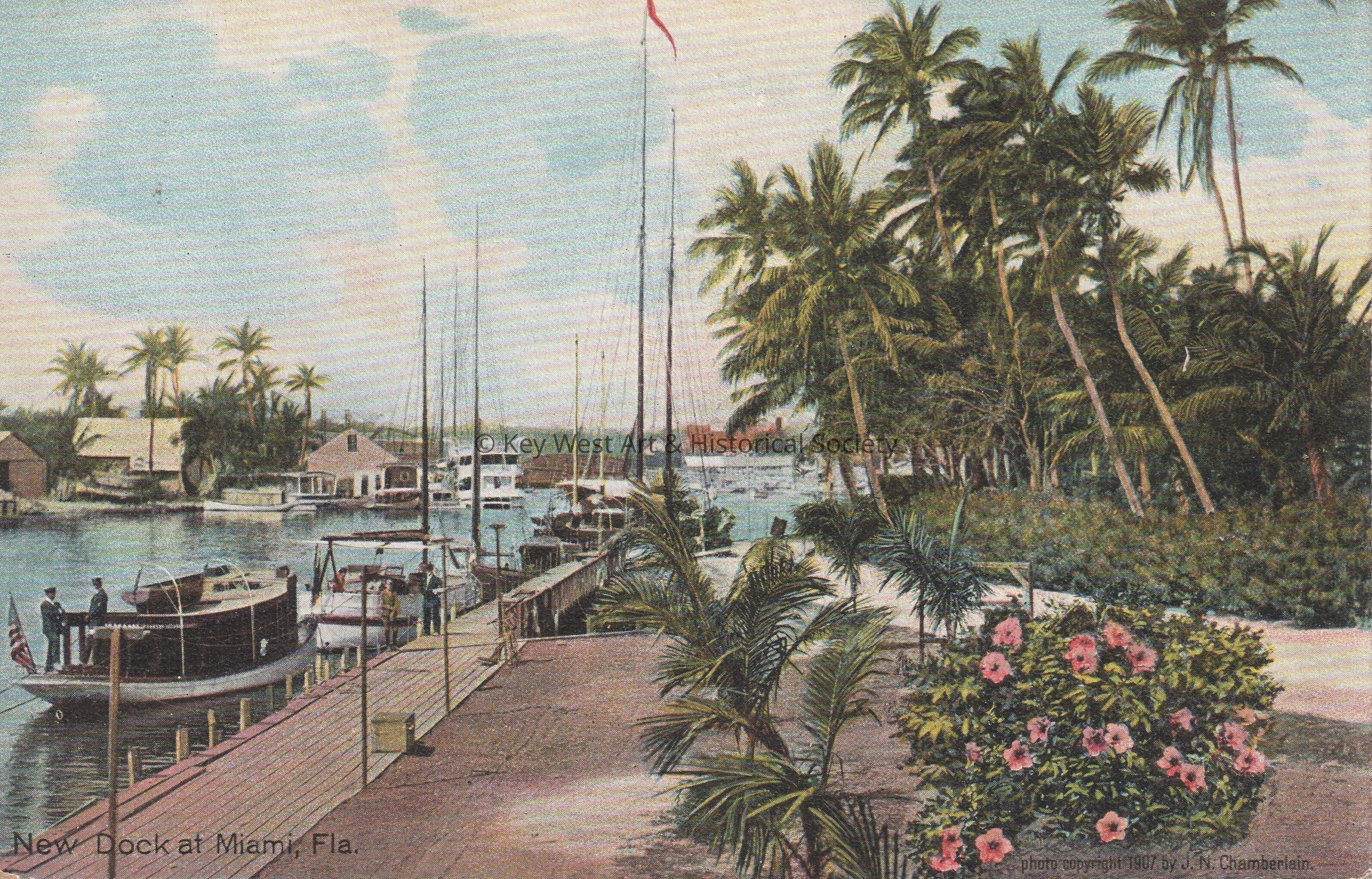 Postcard of boats at dock with foliage in the foreground and homes in the background. The caption reads, ’New Dock at Miami, Florida. Photo copyright 1907 by J.N. Chamberlain.’Collection