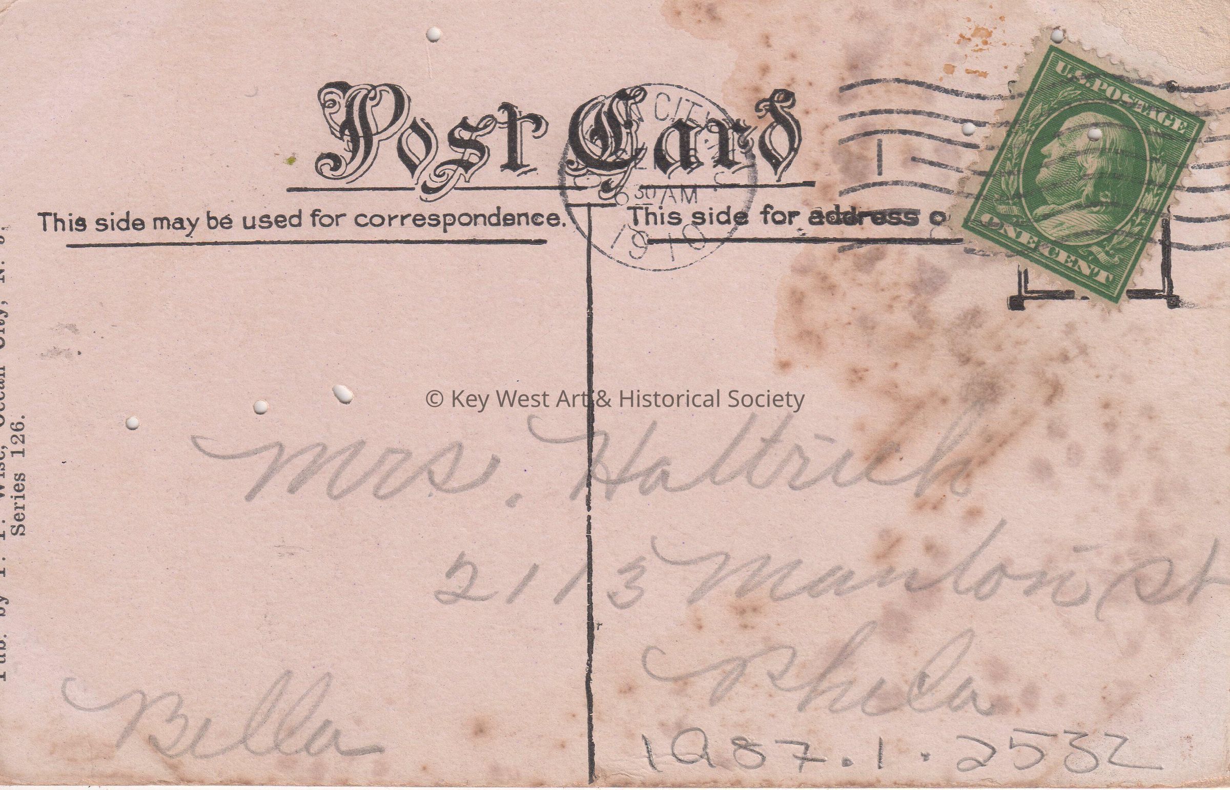 Postcard depicting a bridge. The caption reads, ‘The New Draw Bridge, Electric Fast Line, Ocean City, New Jersey’. The message on the verso reads, ‘Bella’. The card is addressed to Mrs. Hattrick, 2113 Manton Street, Philadelphia, Pennsylvania, and is postmarked Ocean City, New Jersey, September 6, 1910.Subject Place