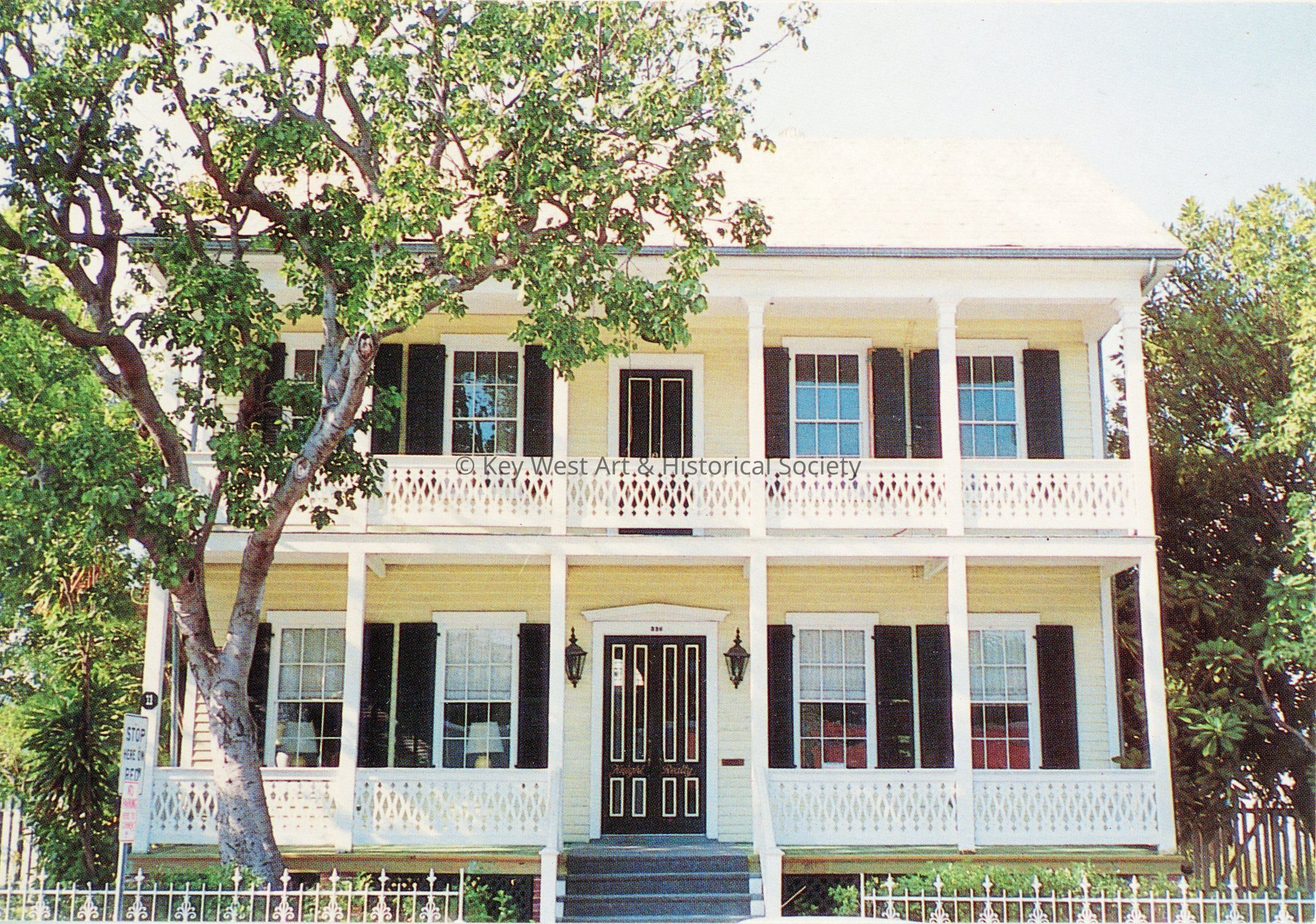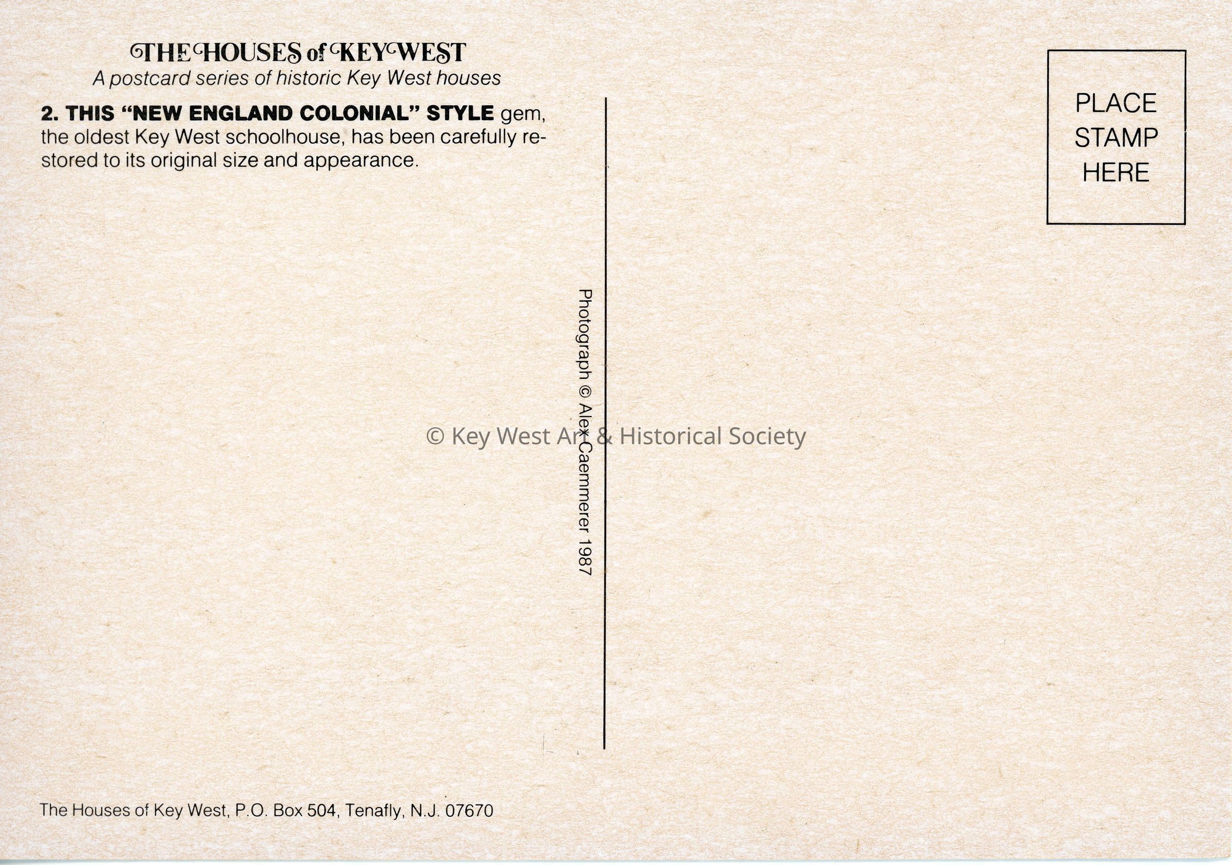 Postcard belonging to 'The Houses of Key West' series depicting the Patterson-Baldwin House located at 336 Duval Street. Notation on verso reads '2. THIS "NEW ENGLAND COLONIAL" STYLE gem, the oldest Key West schoolhouse, has been carefully restored to its original size and appearance.'Subject Place