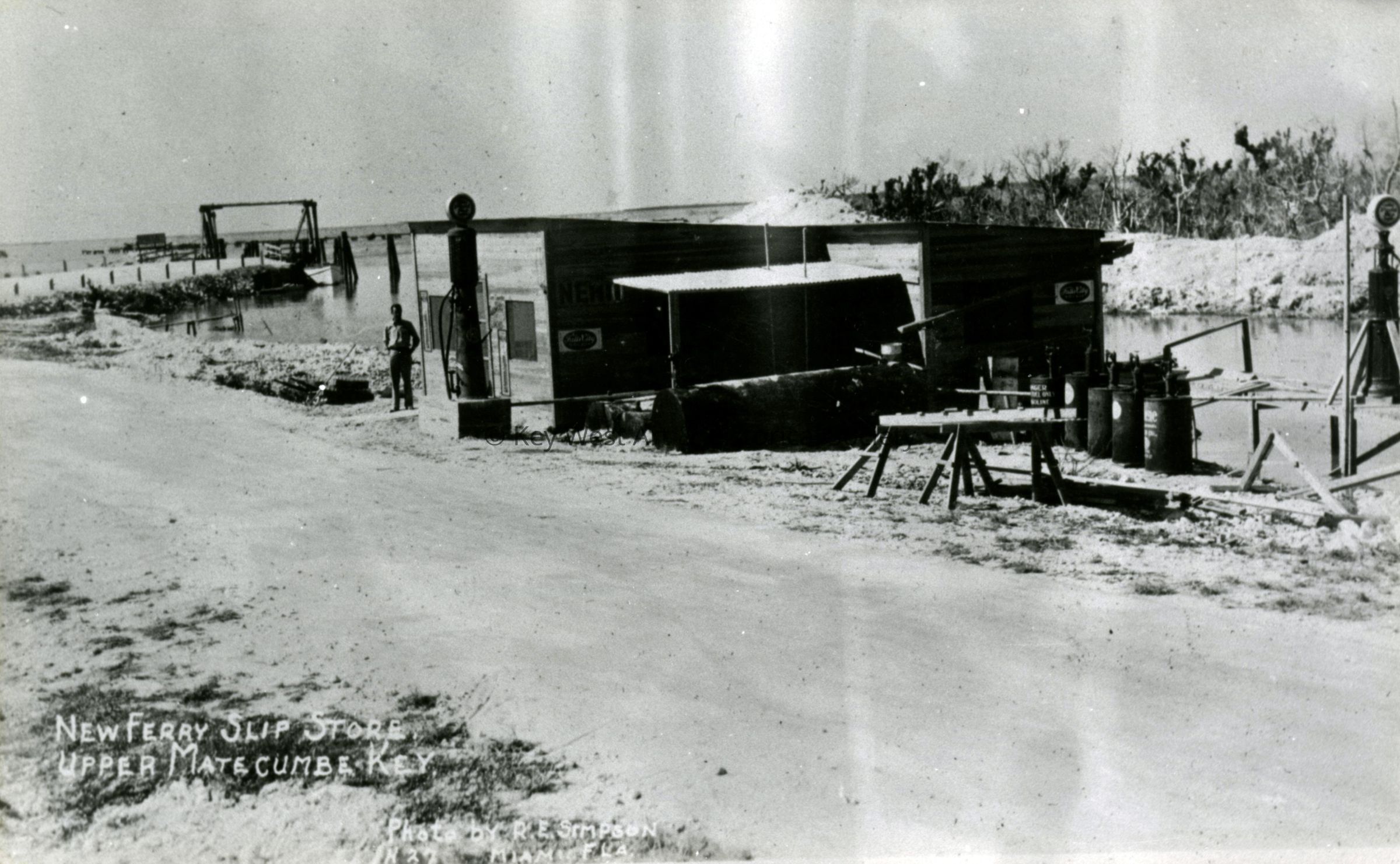 Black and white photograph of the store located at the foot of the Overseas Highway ferry dock in Upper Matecumbe Key.