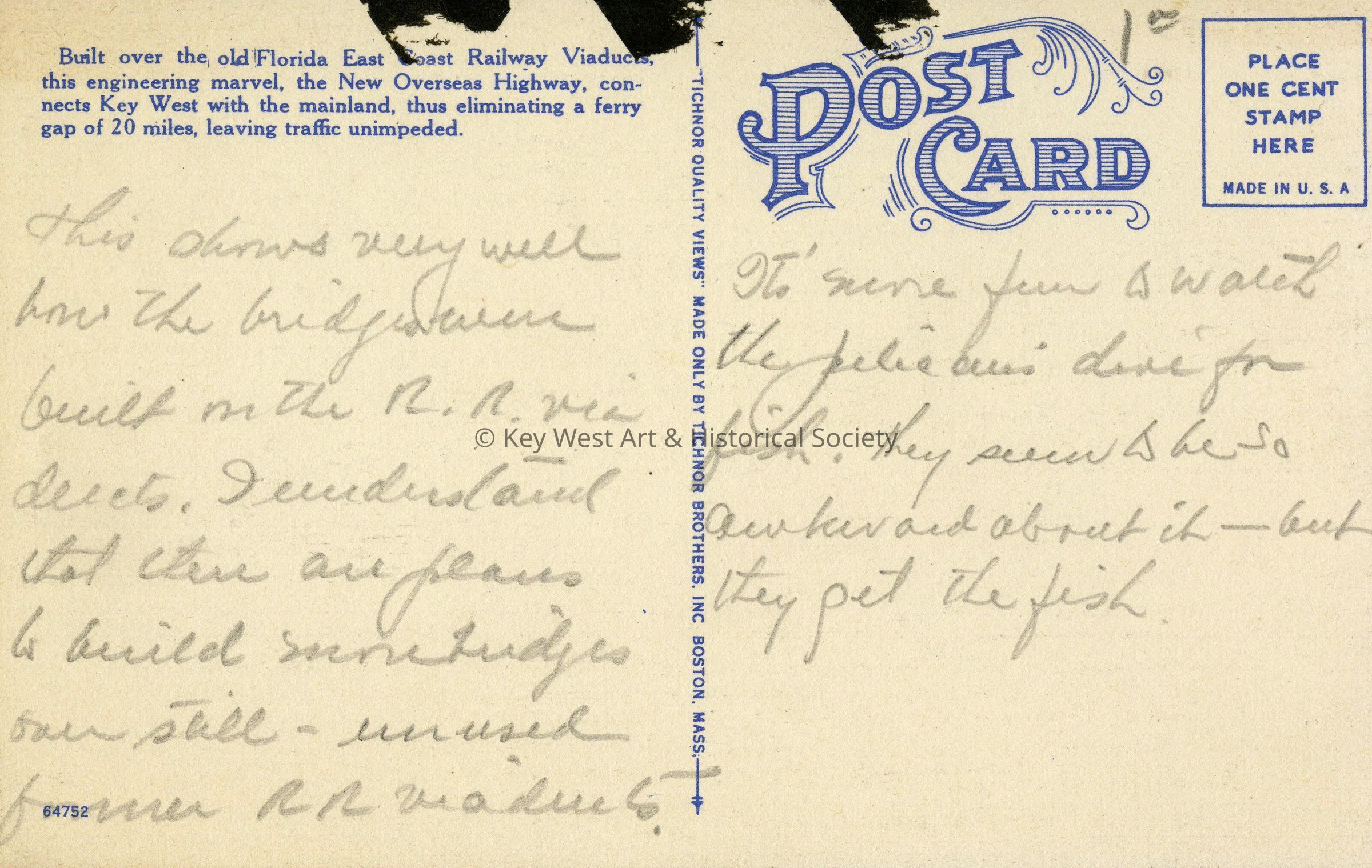 Postcard depicting men fishing from a boat near the Overseas Highway. The caption reads, ‘New Highway Built over the Old Florida East Coast Railway Viaducts on the Way to Key West, Florida.’ Description on verso reads, ‘Built over the old Florida East Coast Railway Viaducts, this engineering marvel, the New Overseas Highway, connects Key West with the mainland, thus eliminating a ferry gap of 20 miles, leaving traffic unimpeded.’Collection