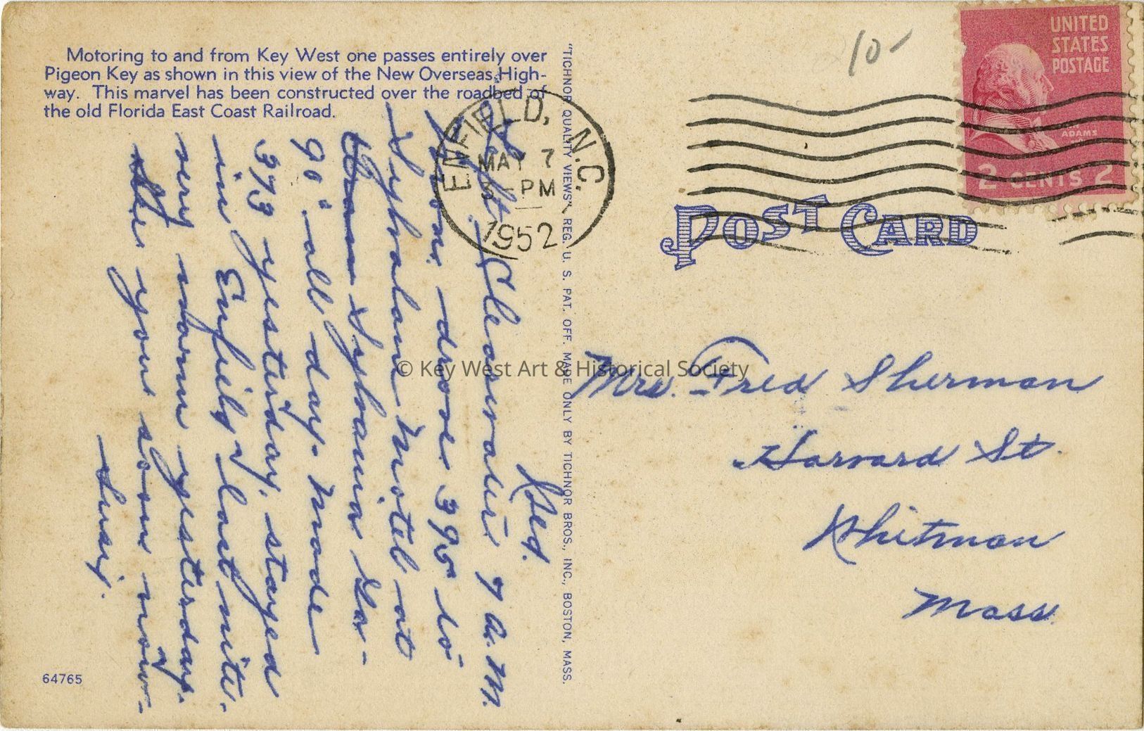 Postcard depicting the new Overseas Highway over Pigeon Key, on the way to Key West, Florida. Motoring to and from Key West one passes entirely over Pigeon Key as shown in this view of the New Overseas Highway. This marvel has been constructed over the roadbed of the old Florida East Coast Railroad.Collection