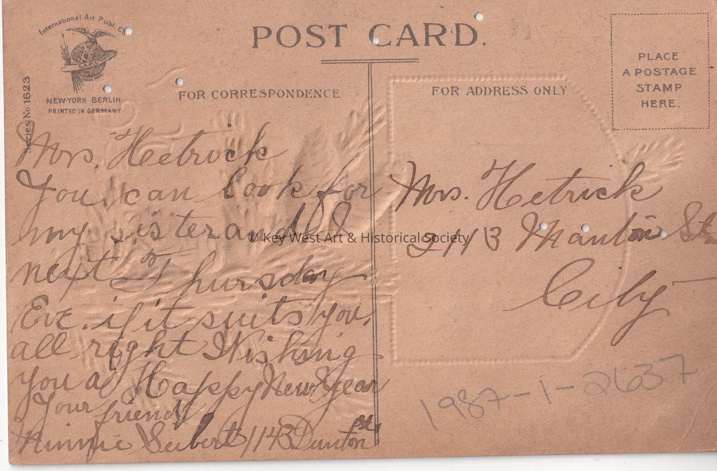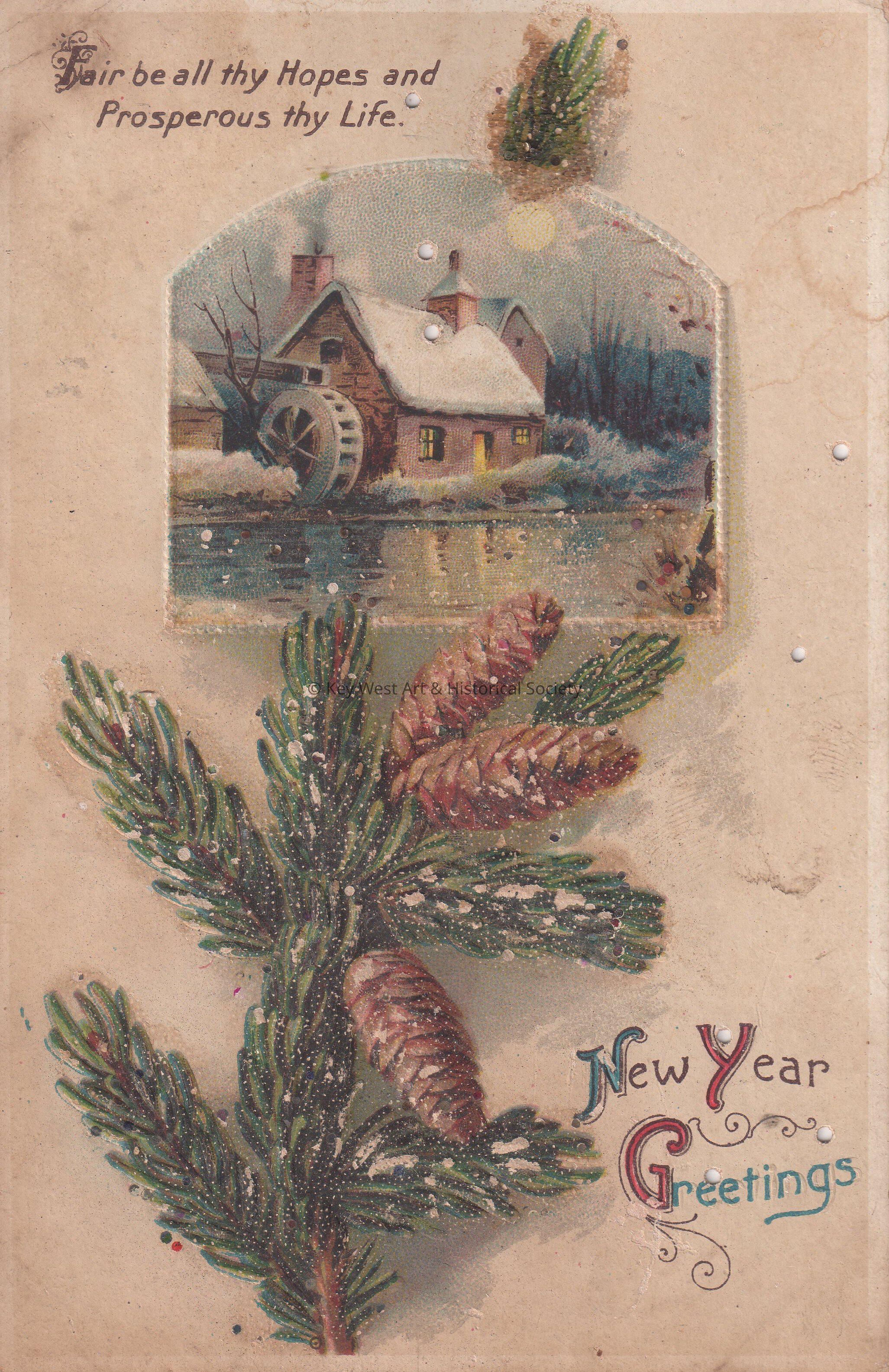 Postcard depicting a pine branch and cones near a painting of a water mill. The caption reads, ‘Fair be all thy Hopes and Prosperous thy Life. New Year Greetings.’ The message on the verso reads, ‘Mrs. Hattrick, You can look for my sister and I next Thursday evening. If it suits you all right. Wishing you a Happy New Year. Your friend, Minnie Subert, 1143 Danton Street.’Collection