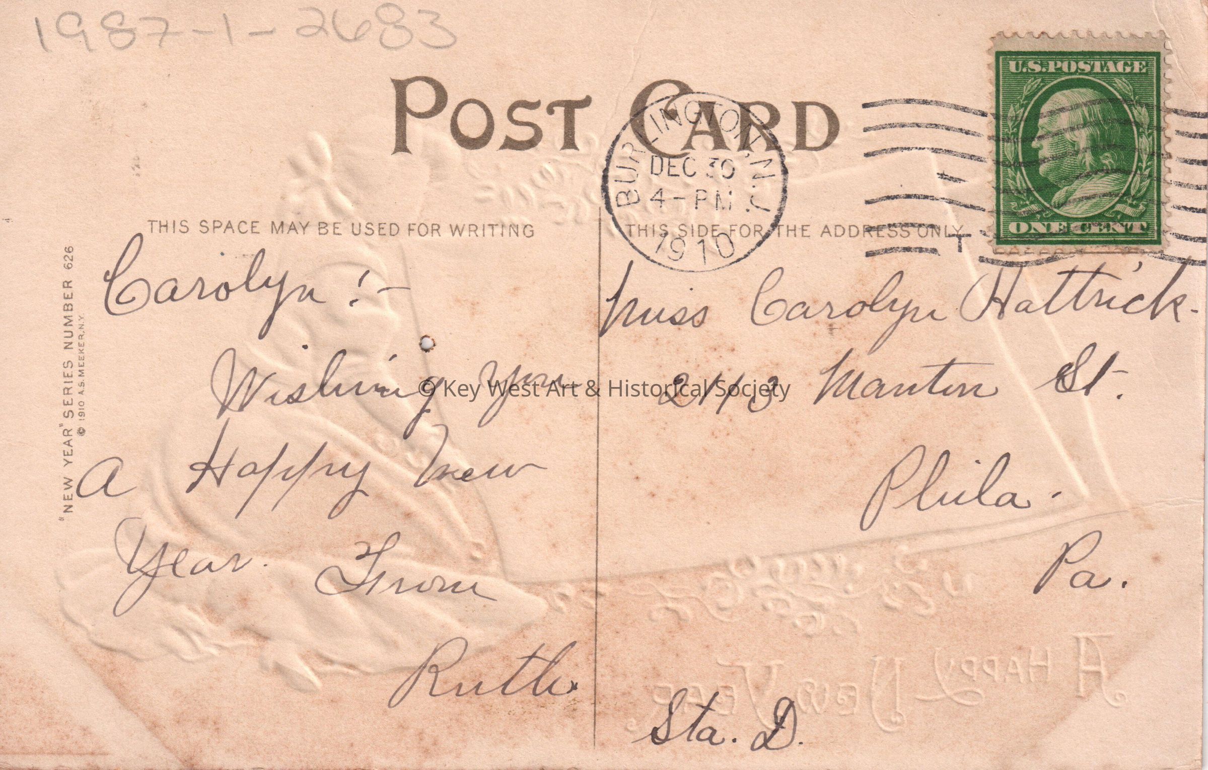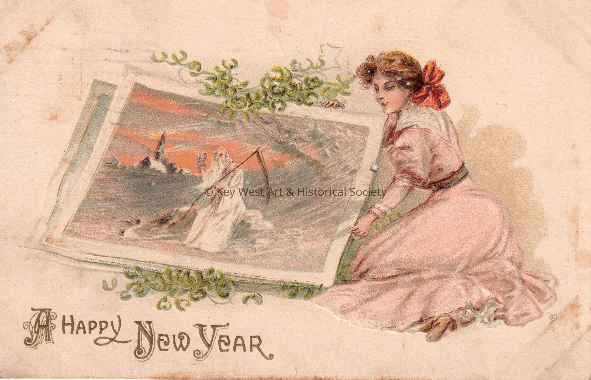 Postcard depicting a young woman holding a painting of Father Time walking in a snowy landscape. The caption reads, ‘A Happy New Year’. The message on the verso reads, ‘Carolyn, Wishing you a Happy New Year. From Ruth’. The card is addressed to Miss Carolyn Hattrick, 2113 Manton Street, Station D, Philadelphia, Pennsylvania, and is postmarked Burlington, New Jersey, December 30, 1910.Collection