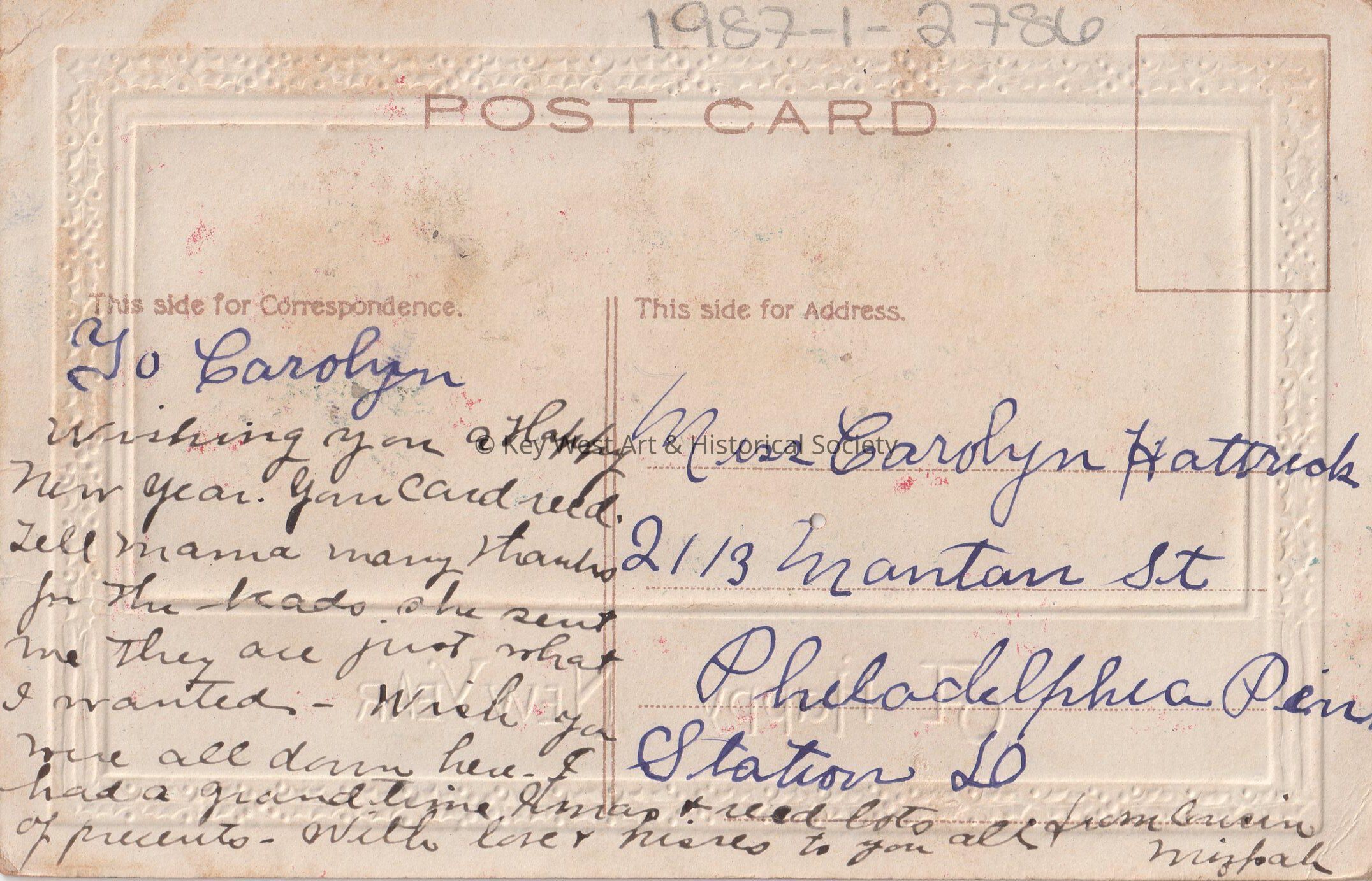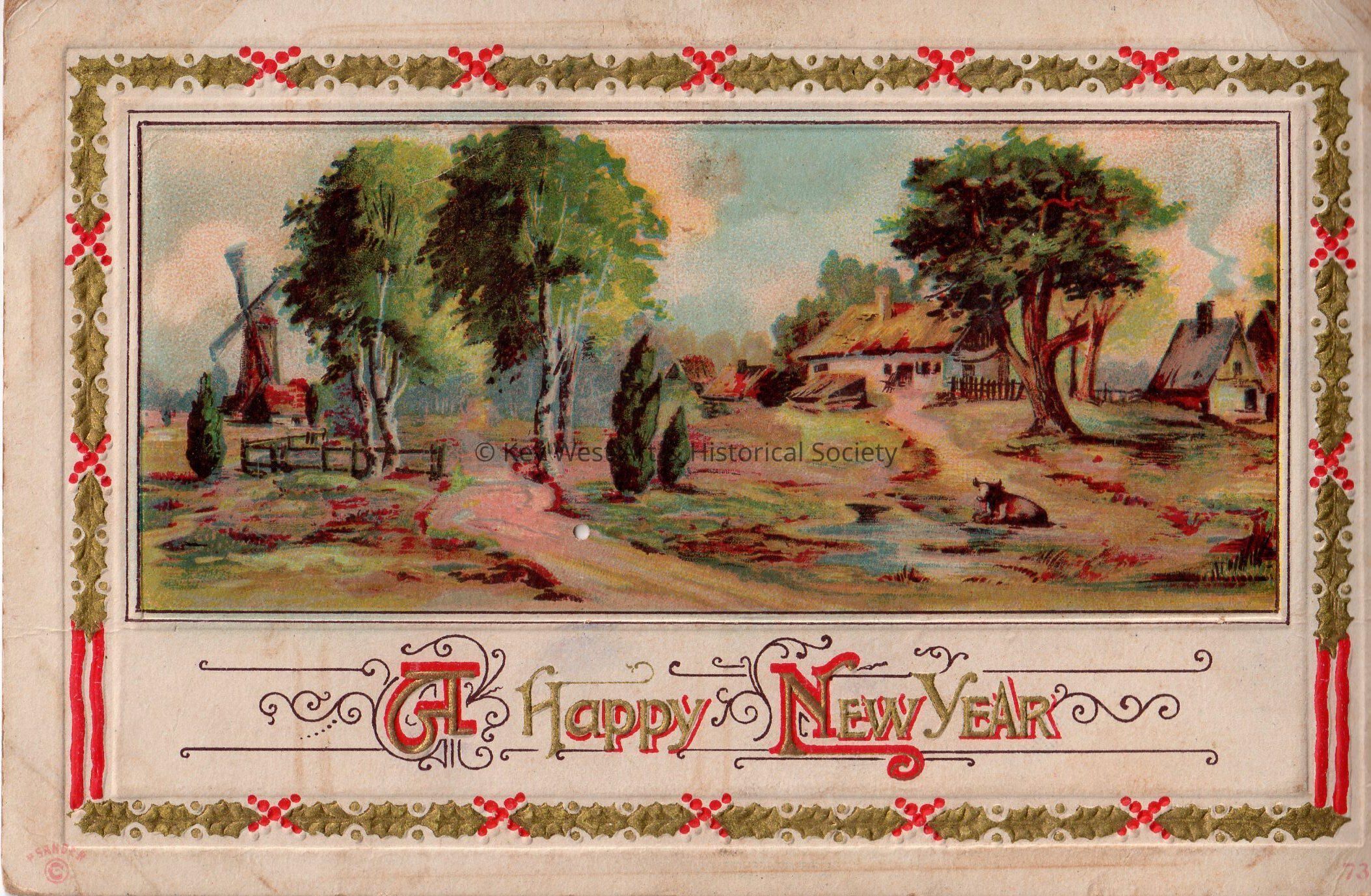 Postcard depicting holly berries and leaves surrounding a painting of a farmhouse and windmill. The caption reads, ‘A Happy New Year’. The message on the verso reads, ‘To Carolyn, Wishing you a Happy New Year. Your card received. Tell Mama many thanks for the beads she sent me. They are just what I wanted – Wish you were all down here. I had a grand time & received lots of presents. With love & kisses to you all from Cousin Mizpah.’ The card is addressed to Miss Carolyn Hattrick, 2113 Manton Street, Philadelphia, Pennsylvania, Station D.Collection