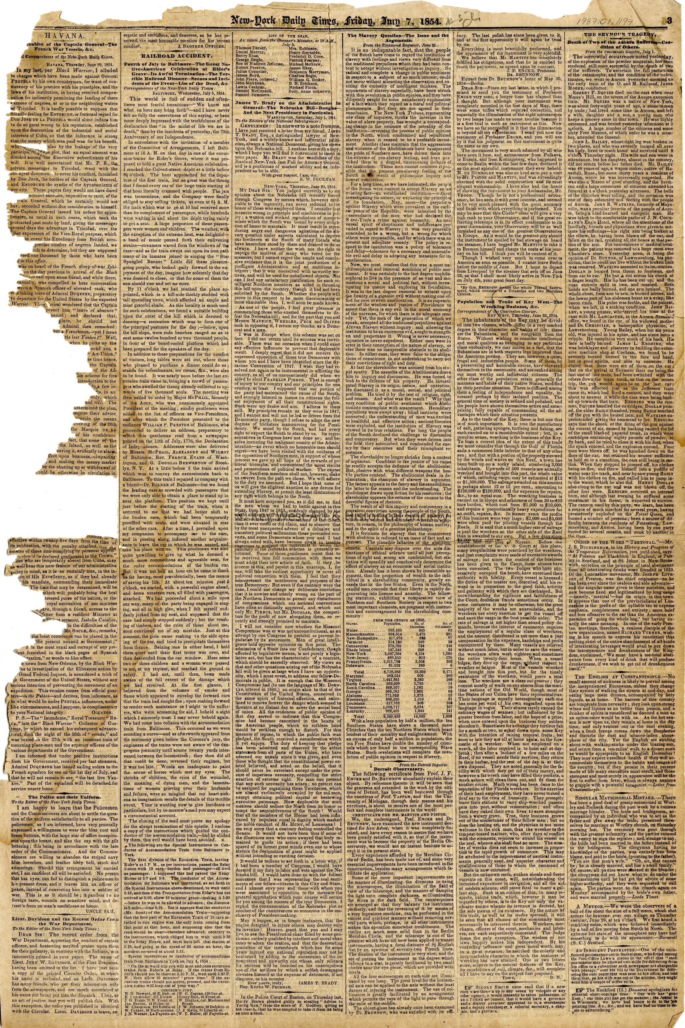 Edition of the New York Daily Times from July 7, 1854, describing the population size and industries of Key West, with a particular focus on wrecking.Collection