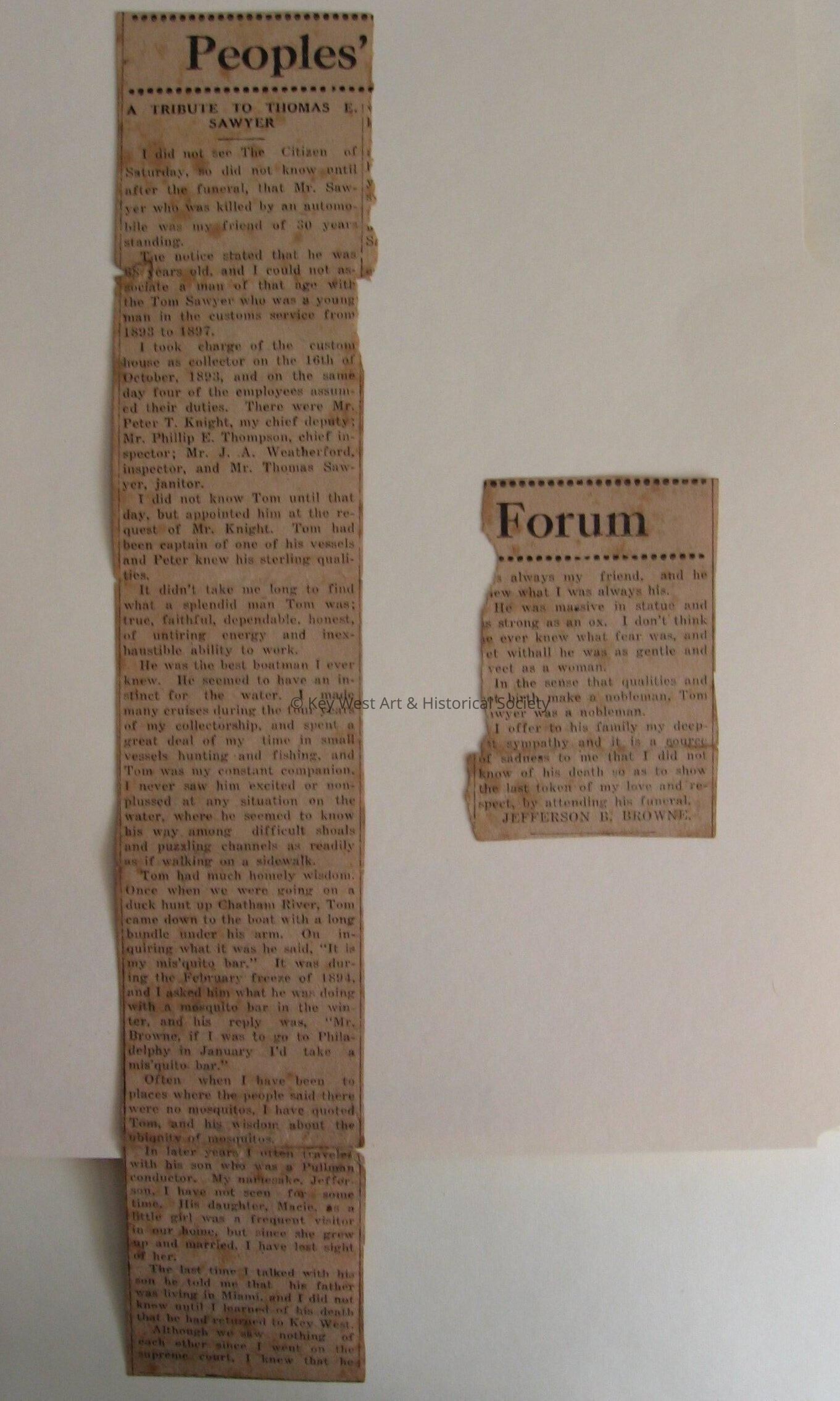 Newspaper clipping "A Tribute to Thomas E. Sawyer". Tribute was written by Jefferson B. Browne. Caption in file reads "Jefferson Browne "wrote the newspaper tribute to my great grandfather"