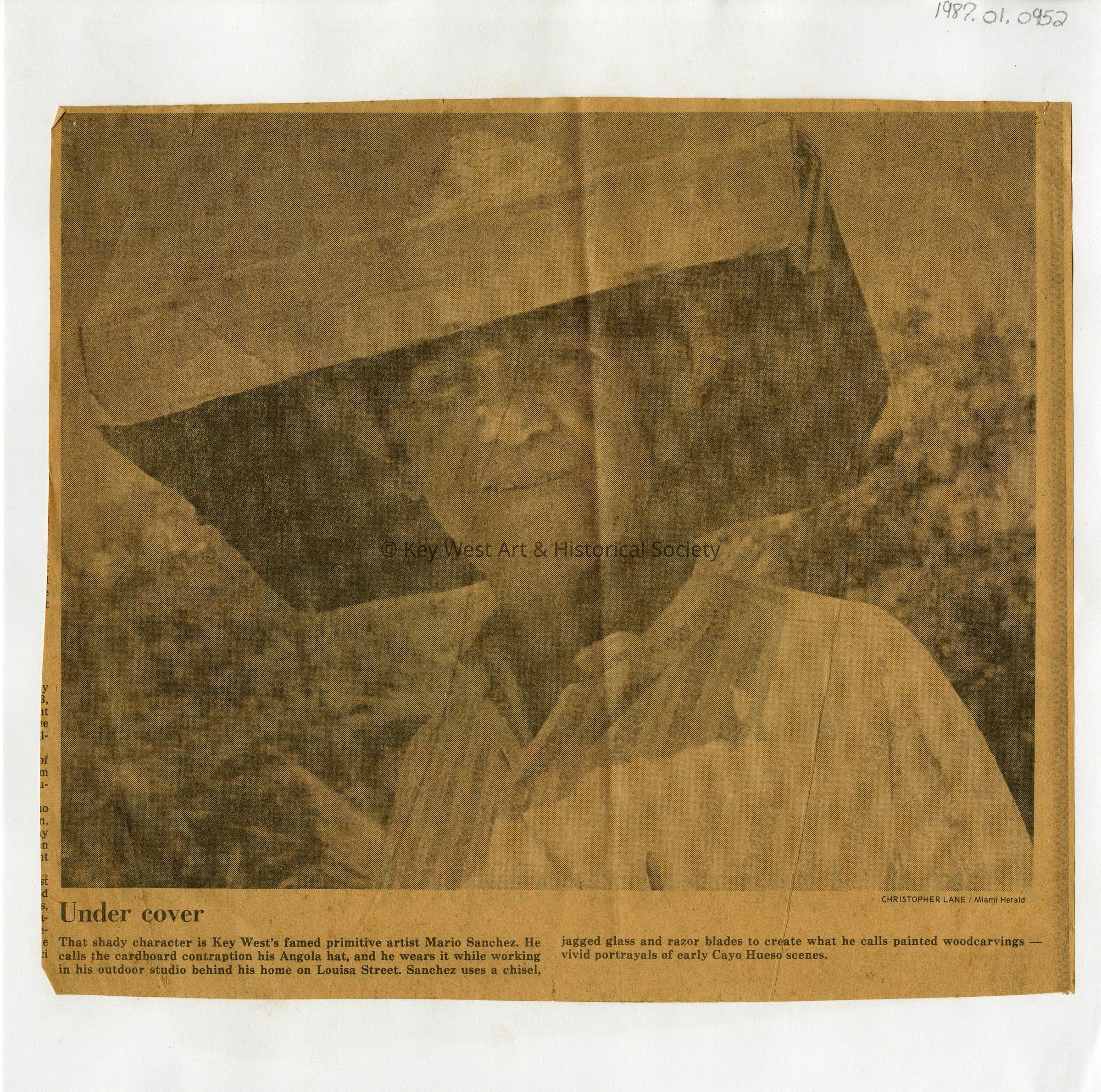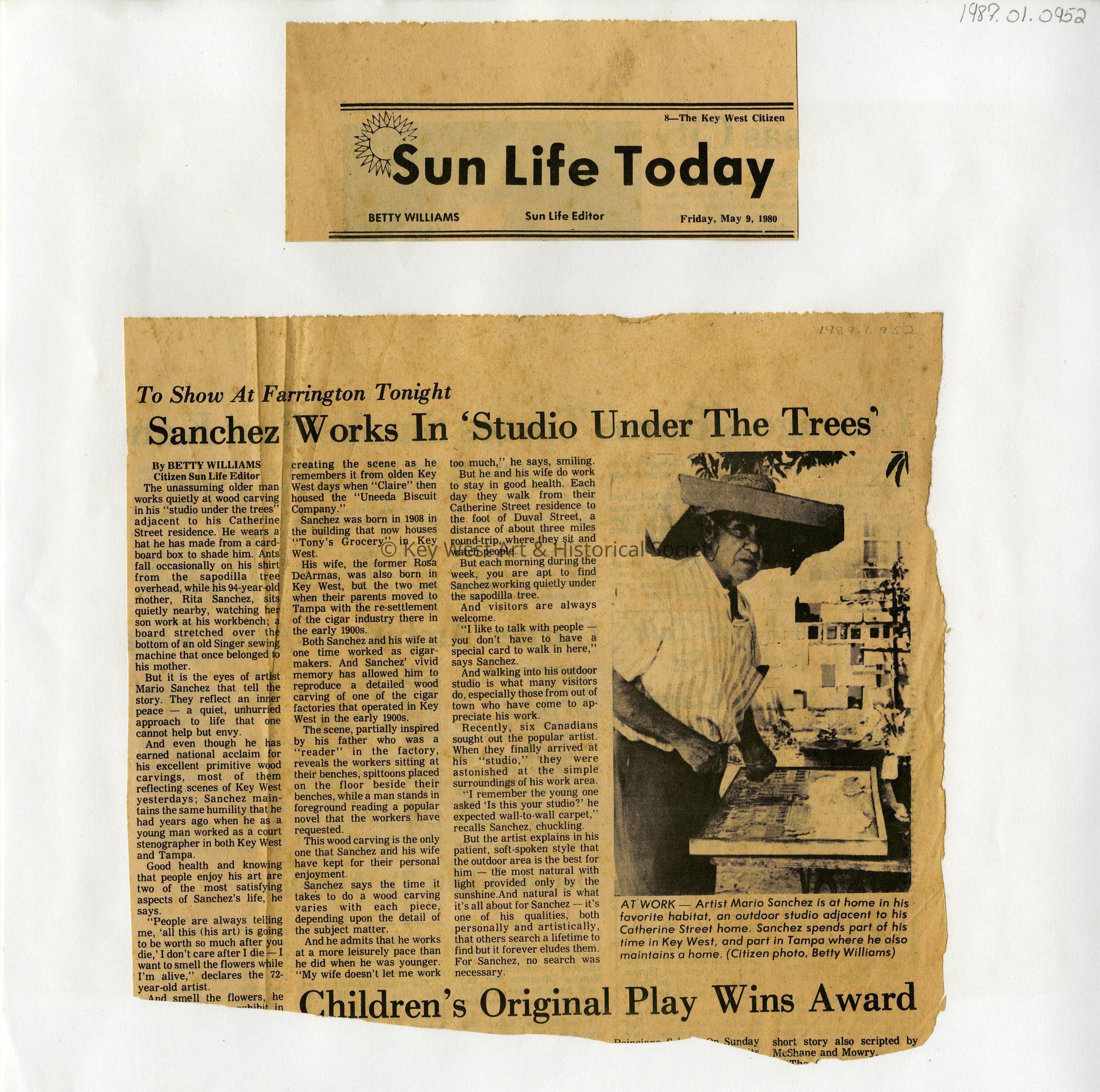 Newspaper article from the Key West Citizen about Mario Sanchez, an upcoming art exhibit at Farrington Gallery and working in his Studio Under the Trees.