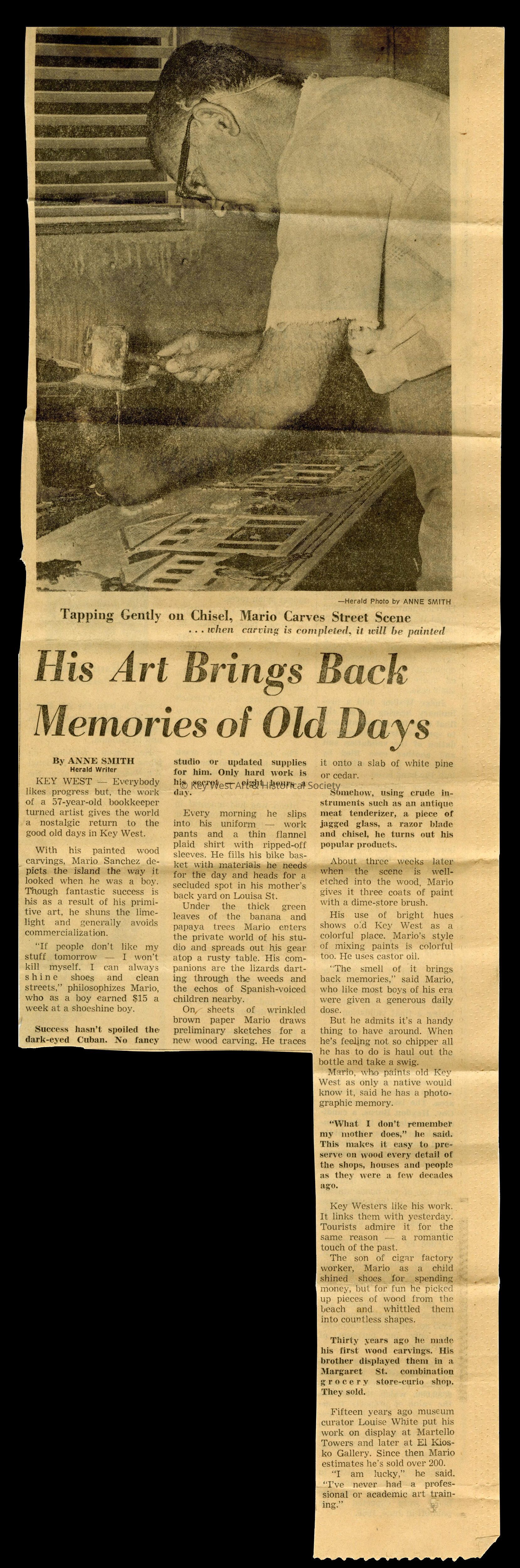 Newspaper article that appeared in the April 29, 1966 edition of the Miami Herald describing Mario Sanchez's artwork. The newspaper article was included in correspondence to Charles and Barbara Martin.Collection