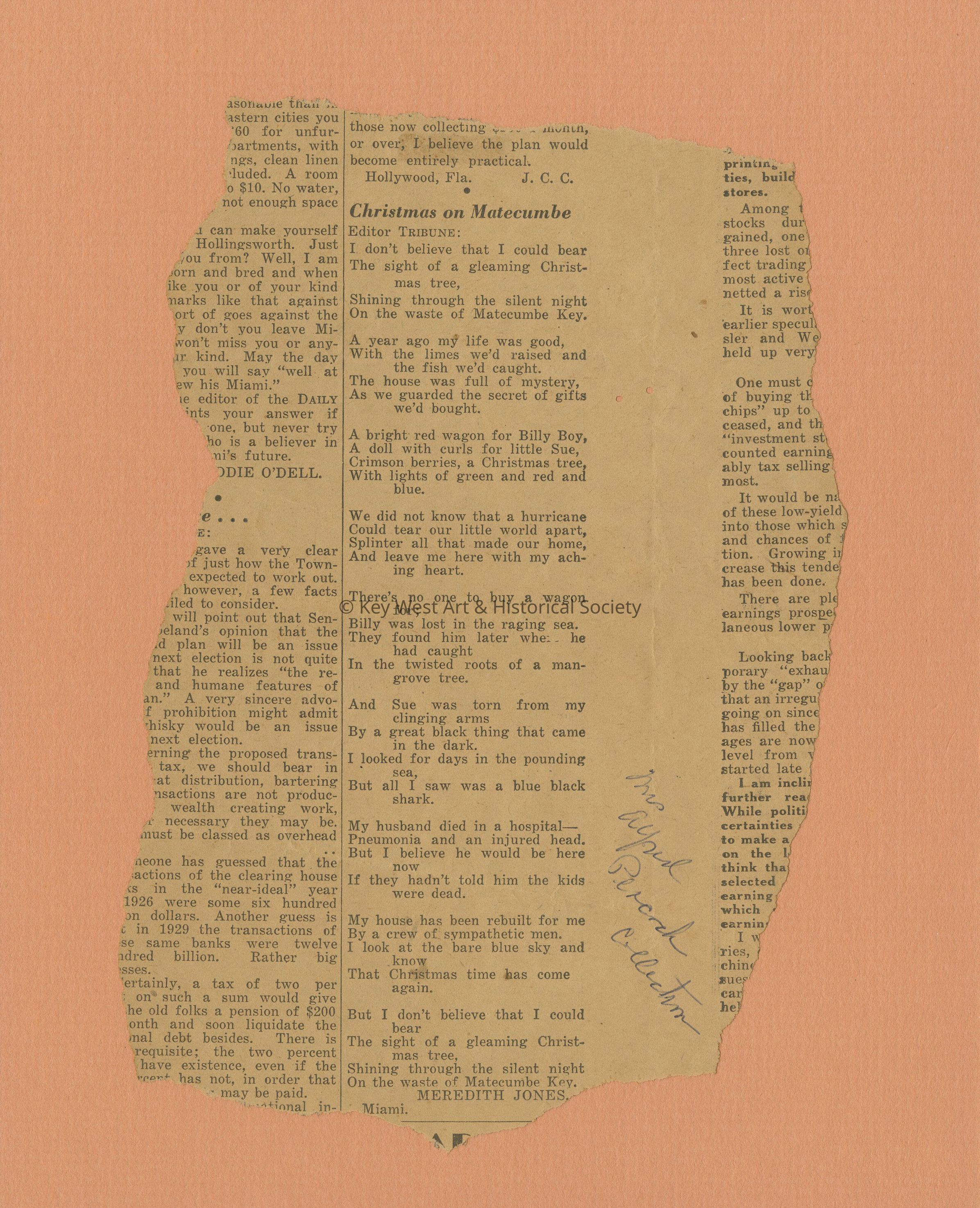 Newspaper clipping "Christmas on Matecumbe". Poem about the Labor Day Hurricane of 1935 written as a letter to the editor.