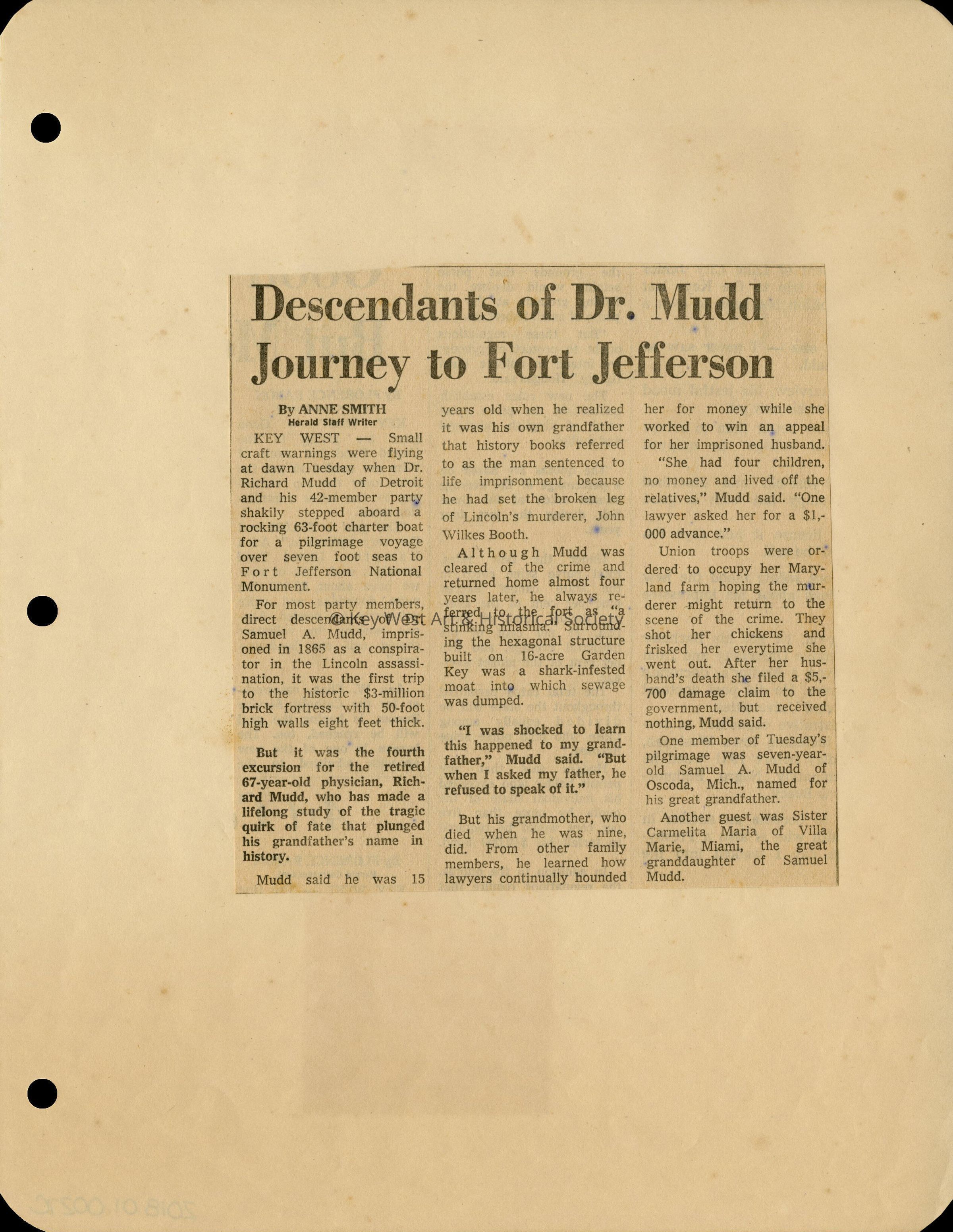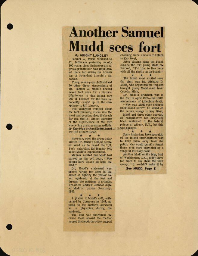 One of nine newspaper clippings, taken either from the Miami Herald or the Key West Citizen, that details a trip to Fort Jefferson to visit the cell of Dr. Samuel A. Mudd.Collection