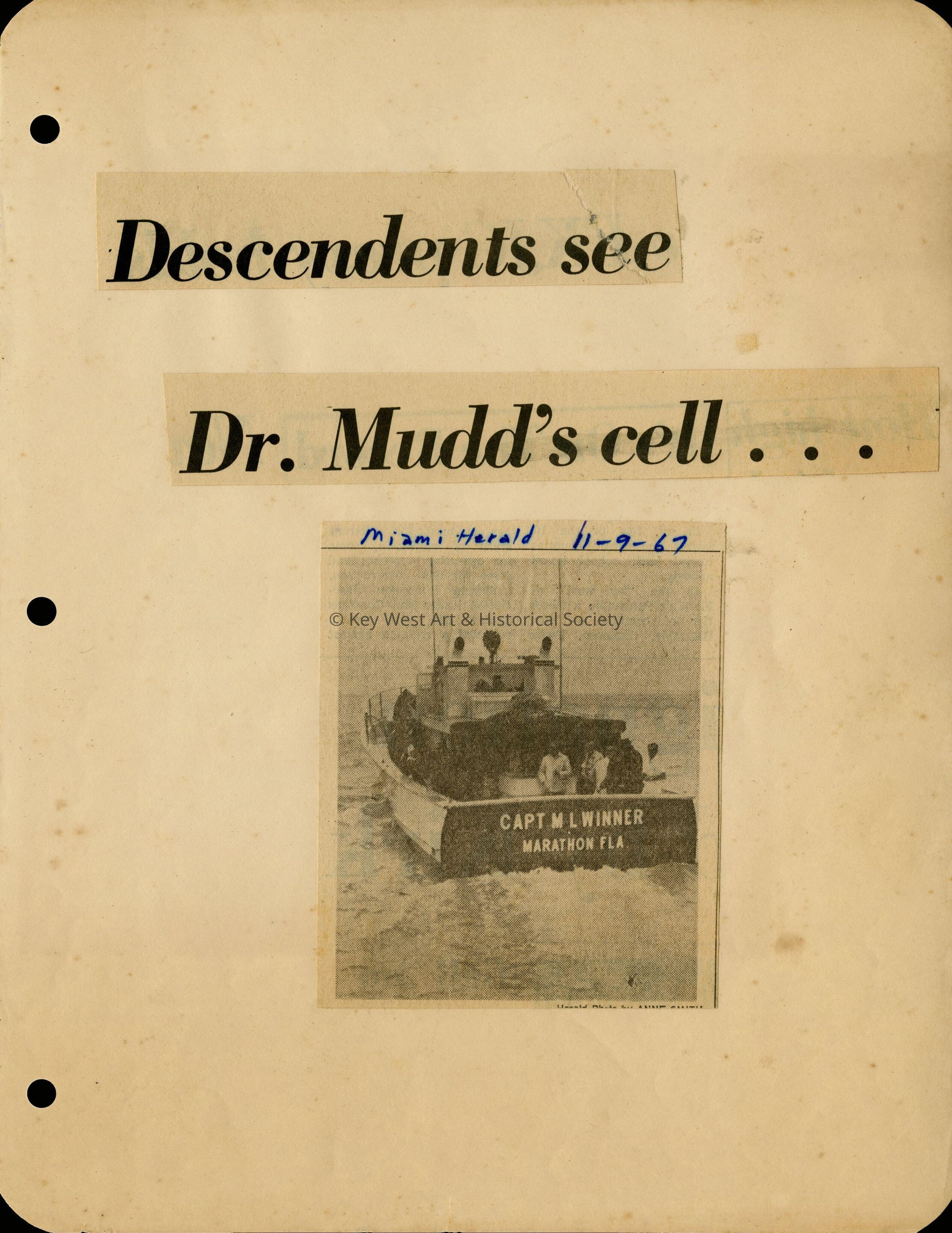 One of nine newspaper clippings, taken either from the Miami Herald or the Key West Citizen, that details a trip to Fort Jefferson to visit the cell of Dr. Samuel A. Mudd.Collection