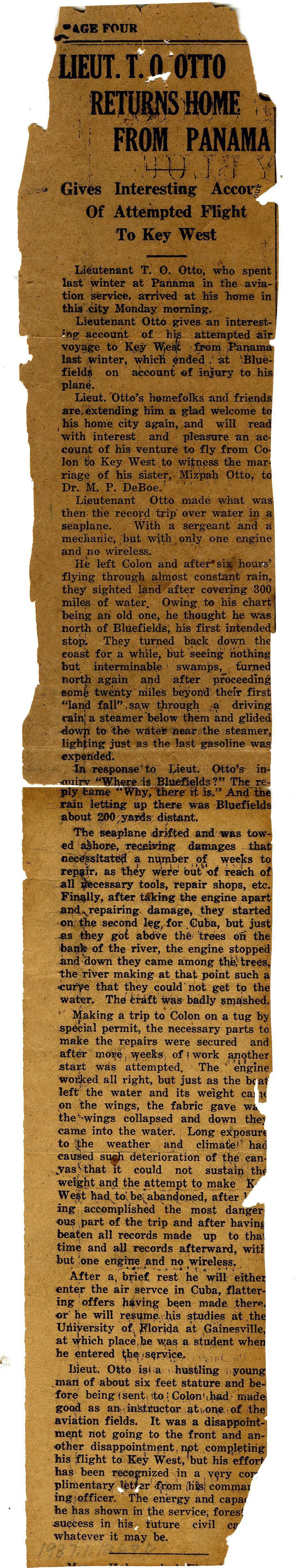 Newspaper clipping referencing Lieutenant Thomas Osgood Otto after his flight from Panama to Key West in 1919. The file also contains three typewritten pages about the flight attempt that ended in Bluefields.
