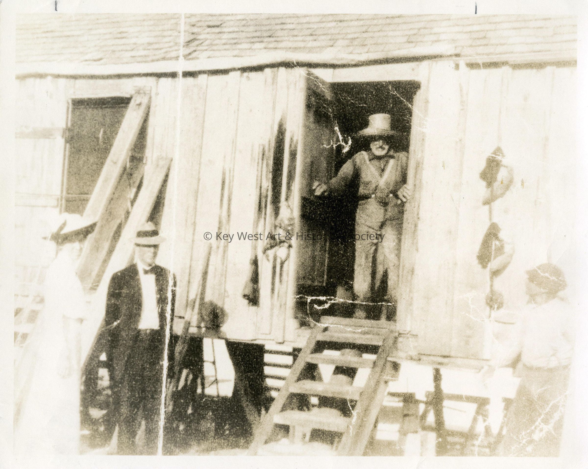 Black and white photograph Nicholas Matcovitch in the door of his house on No Name Key talking, Big Pine Key, with Mr. and Mrs. William J. Krome. Krome was the engineer for the Florida East Coast Railway.Photograph Details