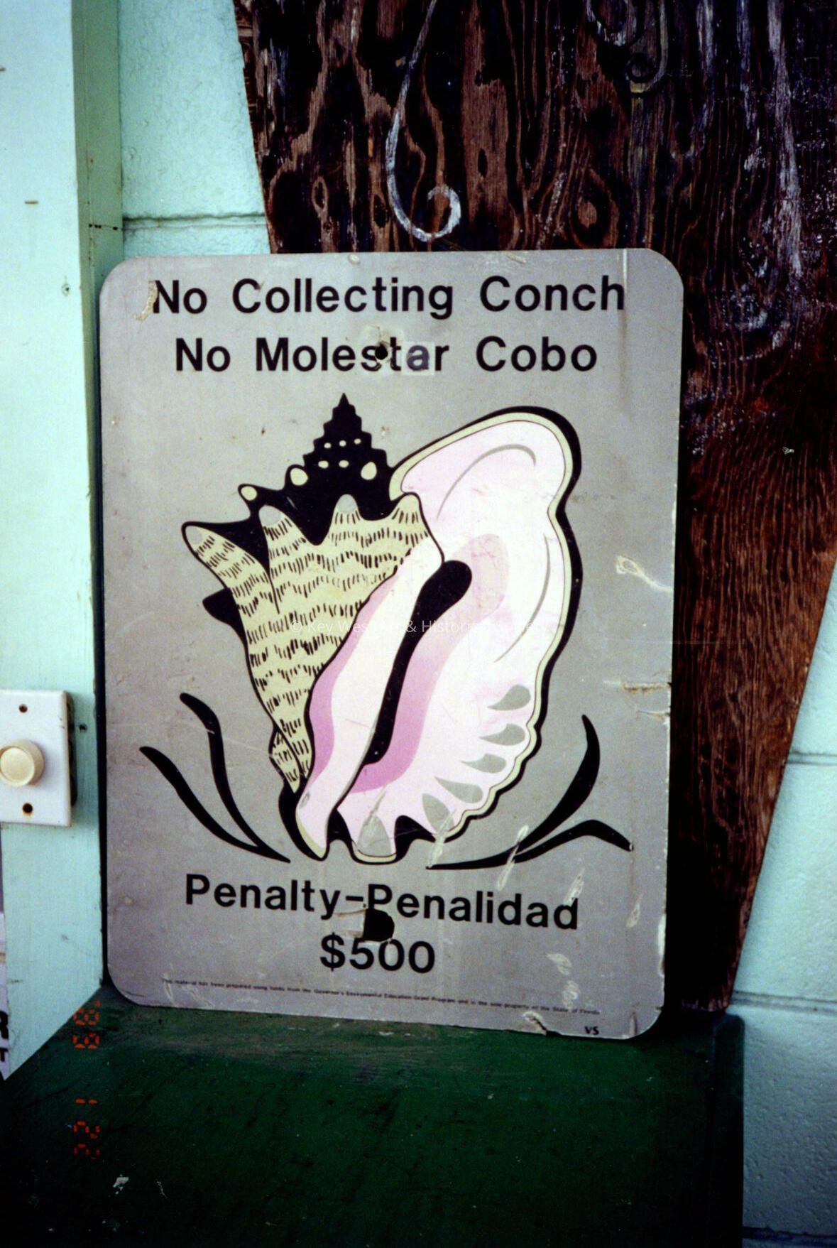 Color photograph taken by historian James M. Goode of a 'No Collecting Conch' sign on during a trip to Key West in February 2001. Printed from Roll 10.Collection