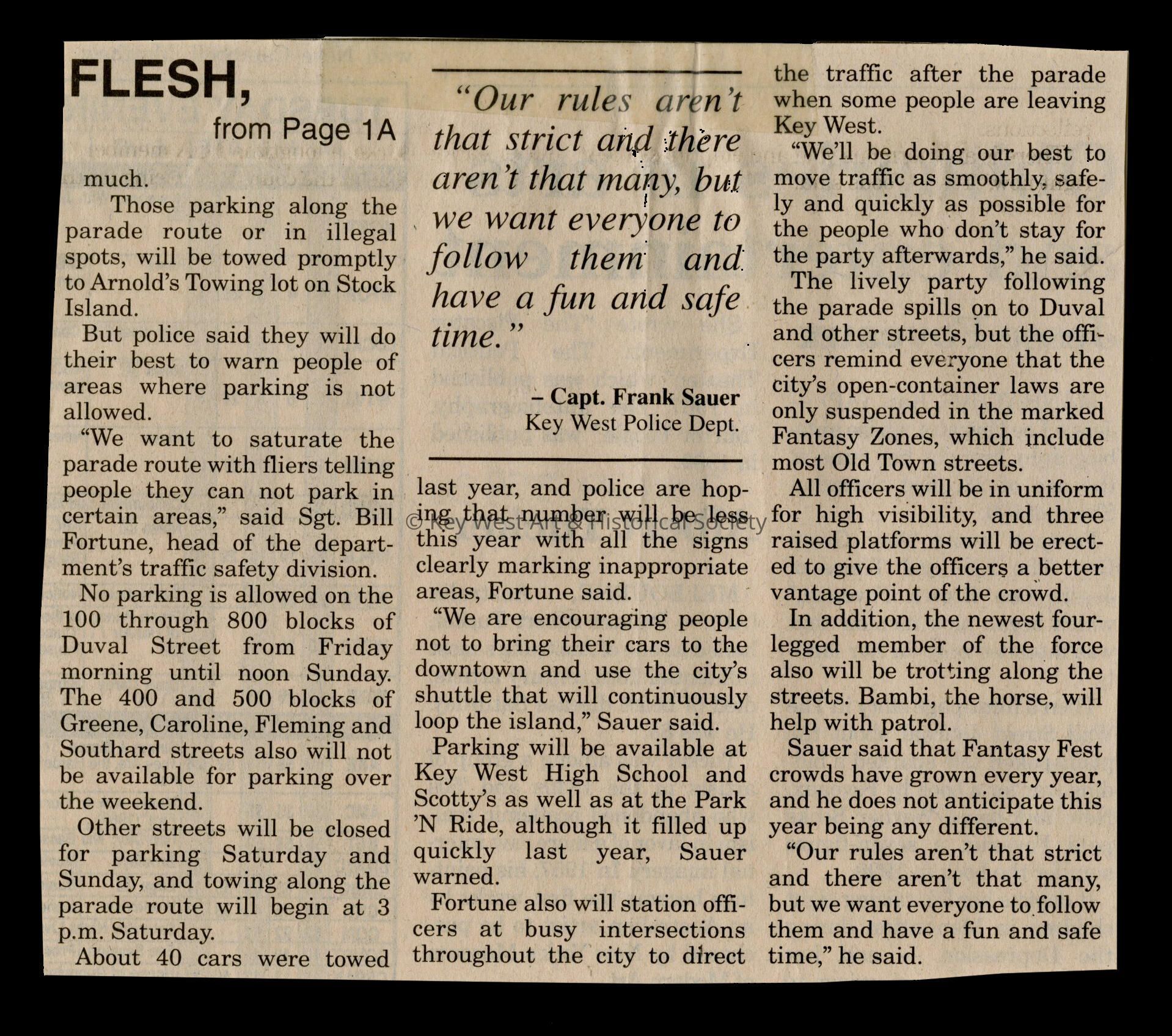 An article in the Key West Citizen about Fantasy Fest that reads No flesh for Fantasy.