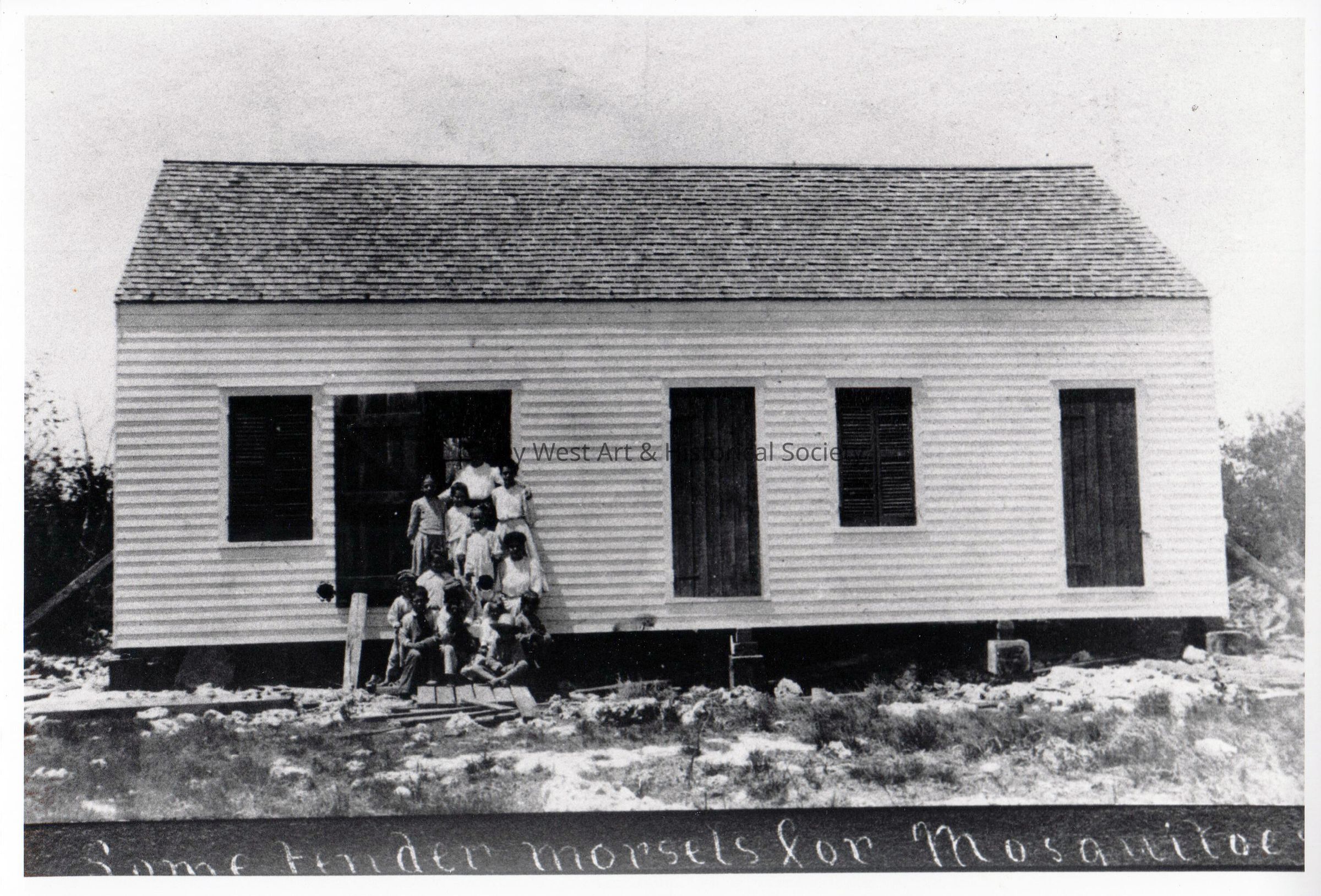 Black and white photograph of school children outside their school house on No Name Key. Caption at the bottom reads, 'some tender morsels for mosquitoes.'