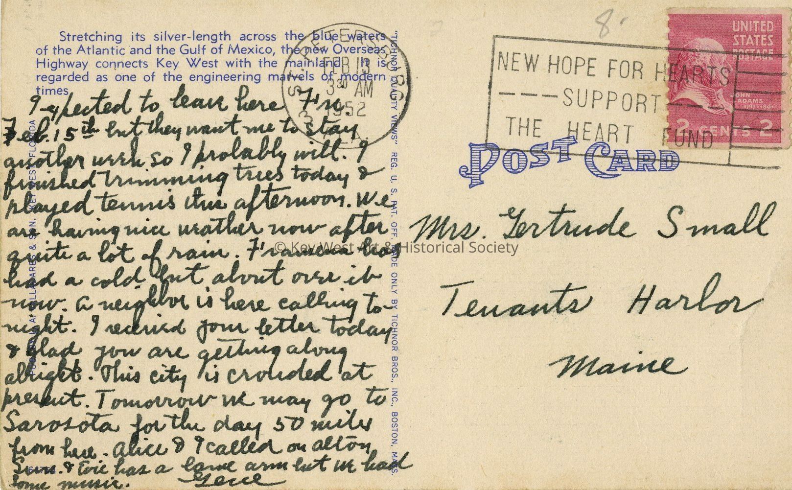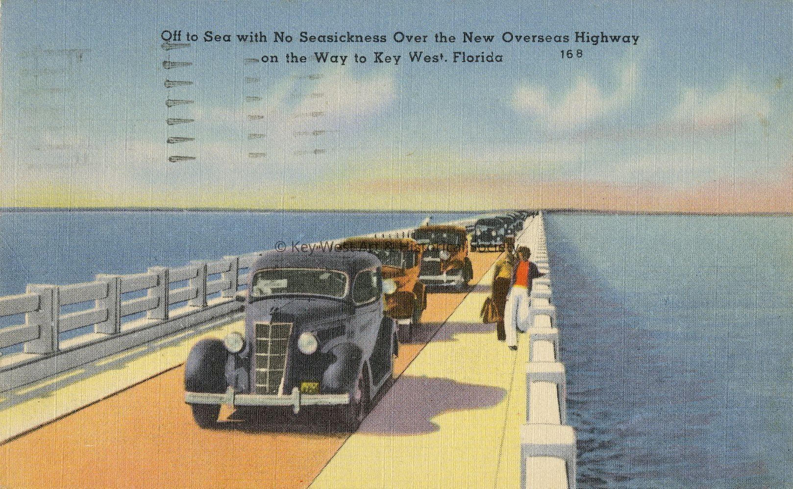 Postcard of off to sea with no seasickness over the new Overseas Highway on the way to Key West, Florida. Stretching its silver-length across the blue waters of the Atlantic and the Gulf of Mexico, the new Overseas Highway connects Key West with the mainland. It is regarded as one of the engineering marvels of modern times.Collection