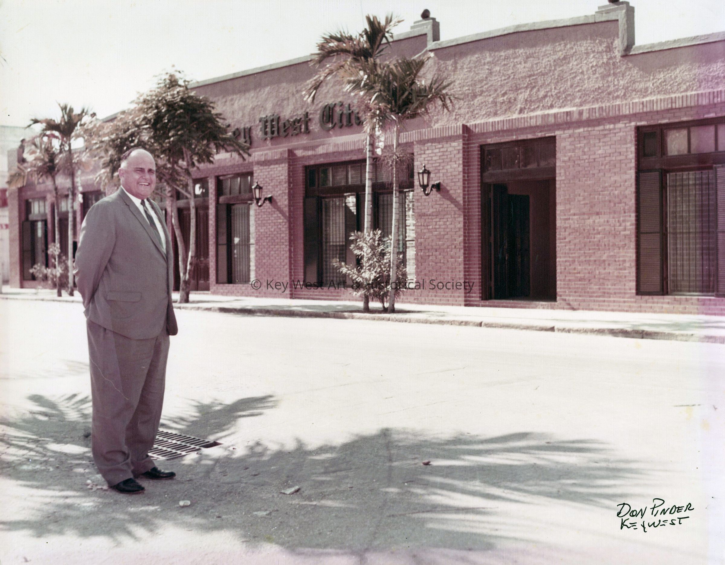 Color photograph of Norman Artman standing outside the Key West Citizen building at 511 Greene Street.