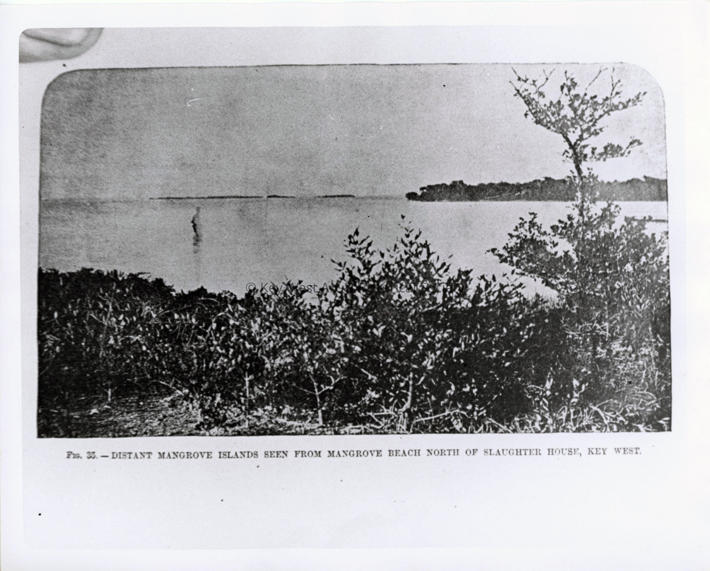 Black and white photograph showing the mangrove island off the northeast coast of Key West. Caption reads, 'Distant mangrove islands seen from Mangrove Beach North of Slaughter House, Key West.'