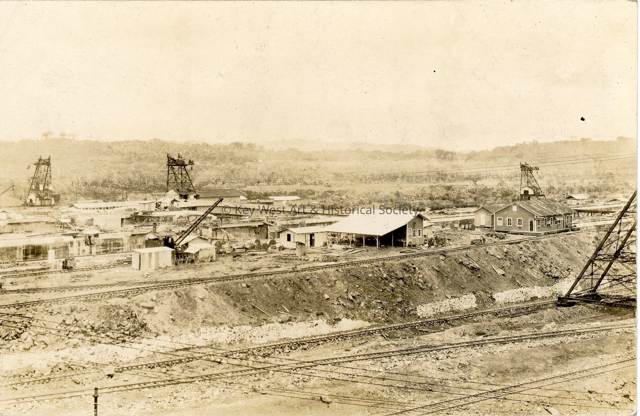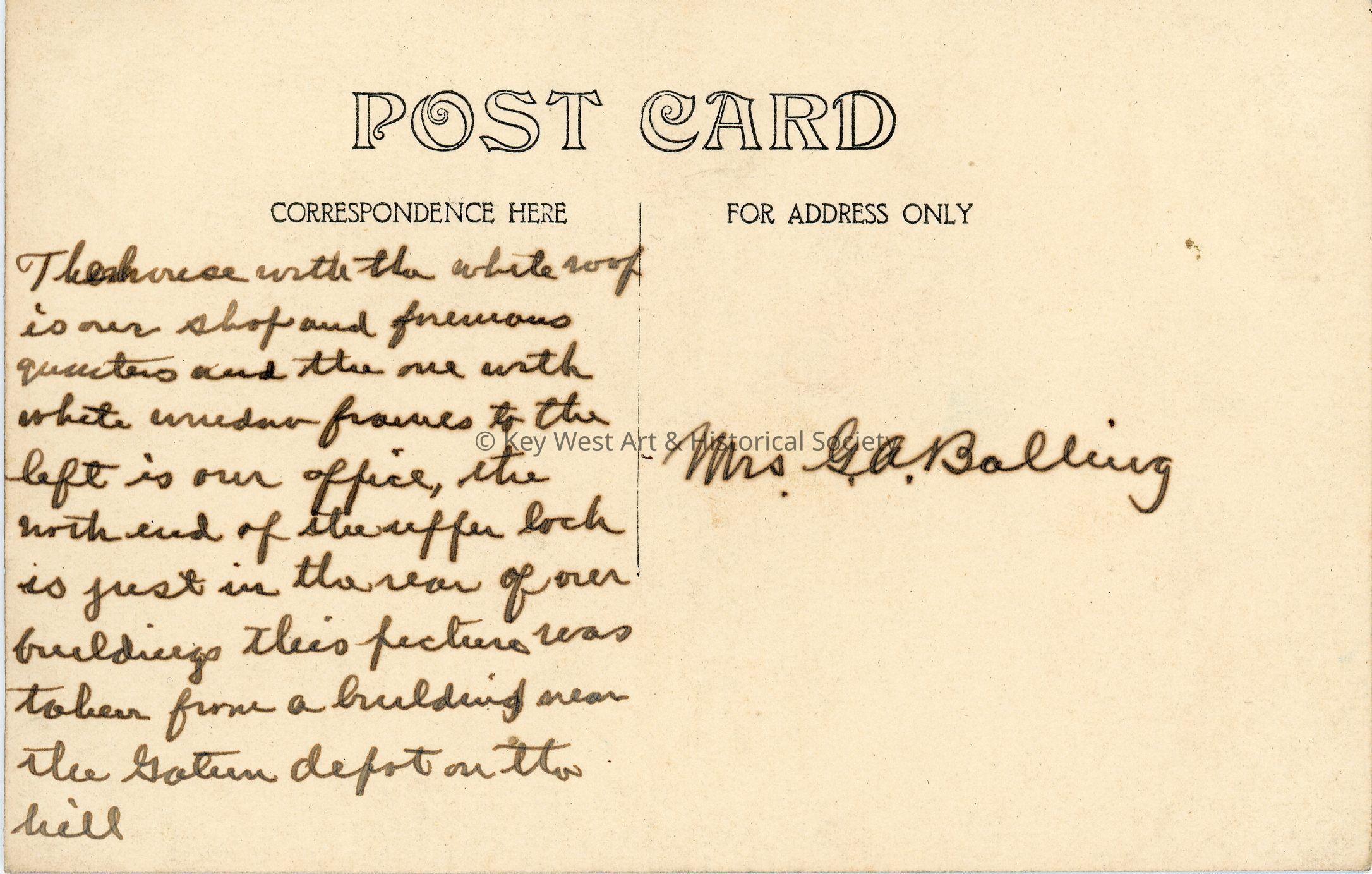 Black and white photograph postcard depicting the construction of the Panama Canal. The photograph shows the foreman's quarters and workshop at the north end of the Gatun Locks. The postcard is addressed to Mrs. G.A. Balling. Verso has a handwritten note.Subject