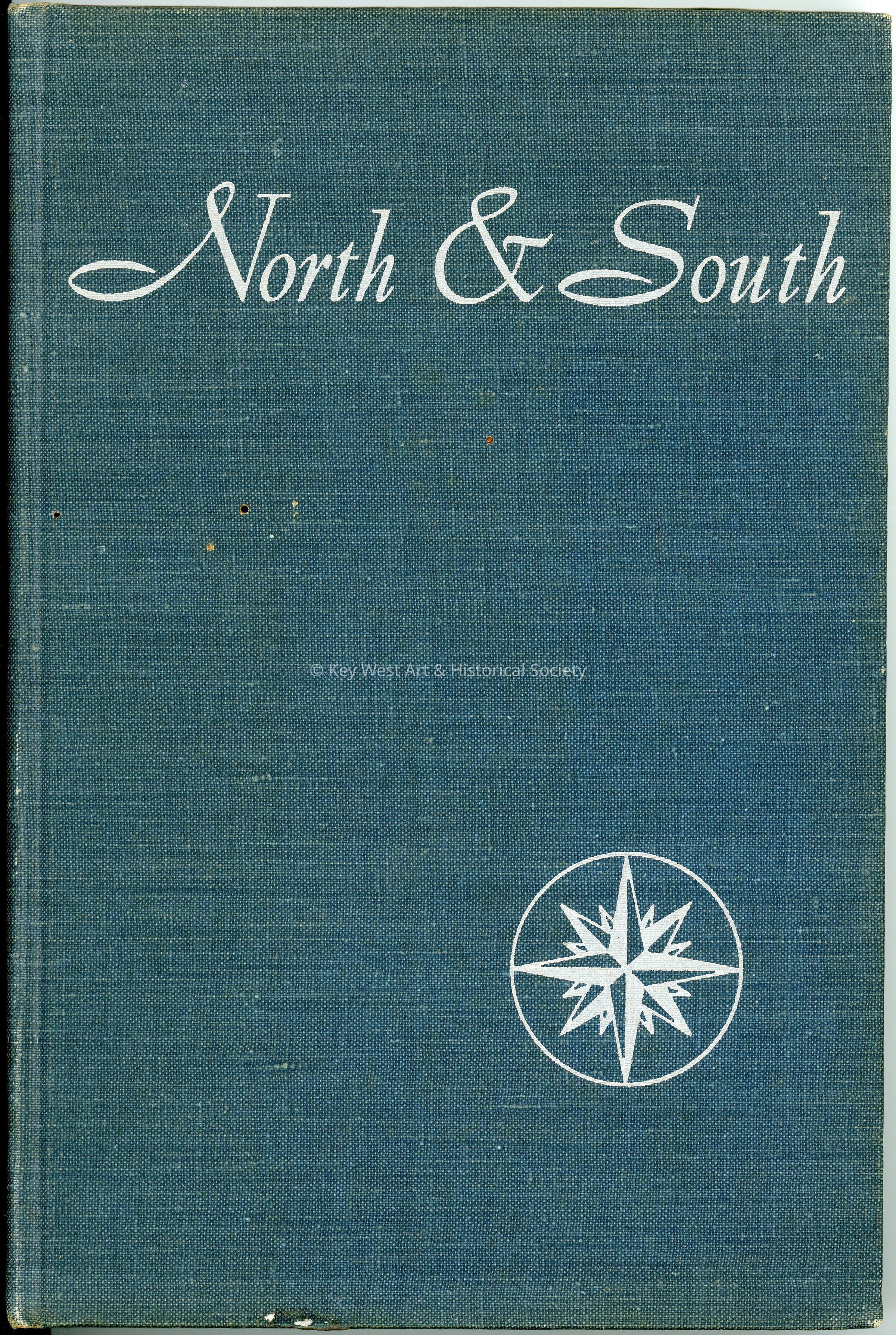 A slim hardcover book with a dark blue buckram textile covering. All lettering on the exterior cover is in silver text. The lower front right of the cover features a silver compass rose. This title was the first printed collection of poems written by Elizabeth Bishop (1911-1979). The first page has a handwritten note from Bishop in blue ink.