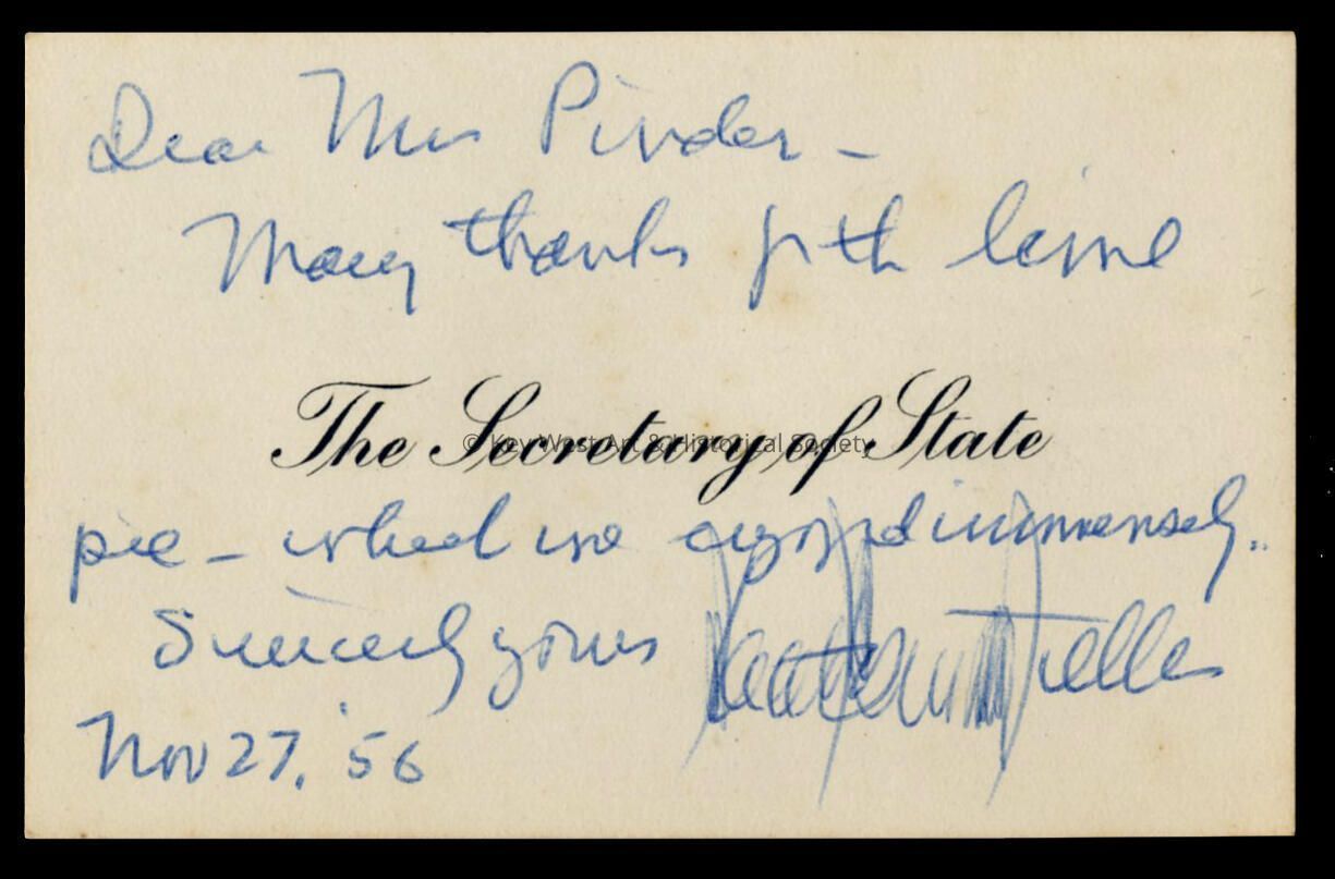 Business card printed 'The Secretary of State' with a note in ink to Joe Pinder's wife that reads, 'Dear Mrs. Pinder - Many thanks for the lime pie - which we enjoyed immensely. Sincerely yours, John Foster Dulles'. Dulles was the Secretary of State to U.S. President Dwight D. Eisenhower.