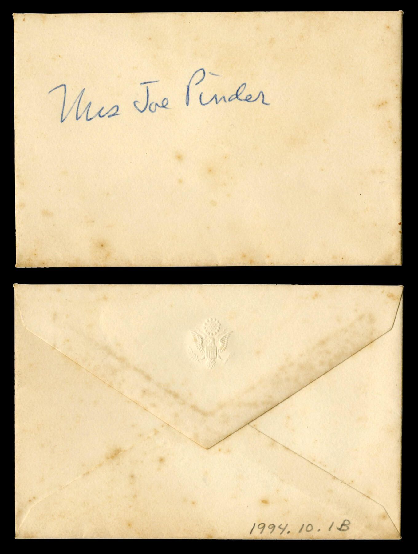 Envelope with Presidential seal that included a card for Mrs. Joe Pinder sent by Secretary of State, John Foster Dulles. Dulles was the Secretary of State to U.S. President Dwight D. Eisenhower.