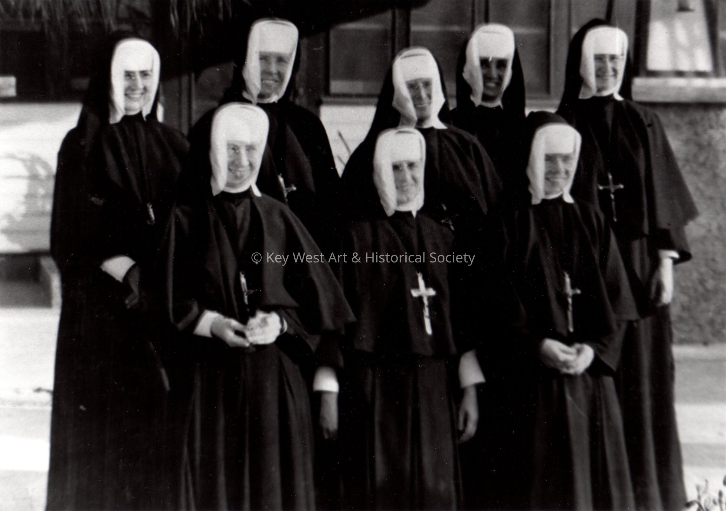Group of nuns from the Convent of Mary Immaculate in Key West, in 1945. L-r 1st row, S. Rose Eucharista, S. Laurence Emilia, and S. Elizabeth Cecilia. 2nd row, S. Mary Monica, S. Imelda Marie, S. Mary Roselina, S. Monica Mary, S. Claire Elizabeth (S. Mary Roselina died on 11/16/1991 at the age of 99 years and 8 months.)Collection