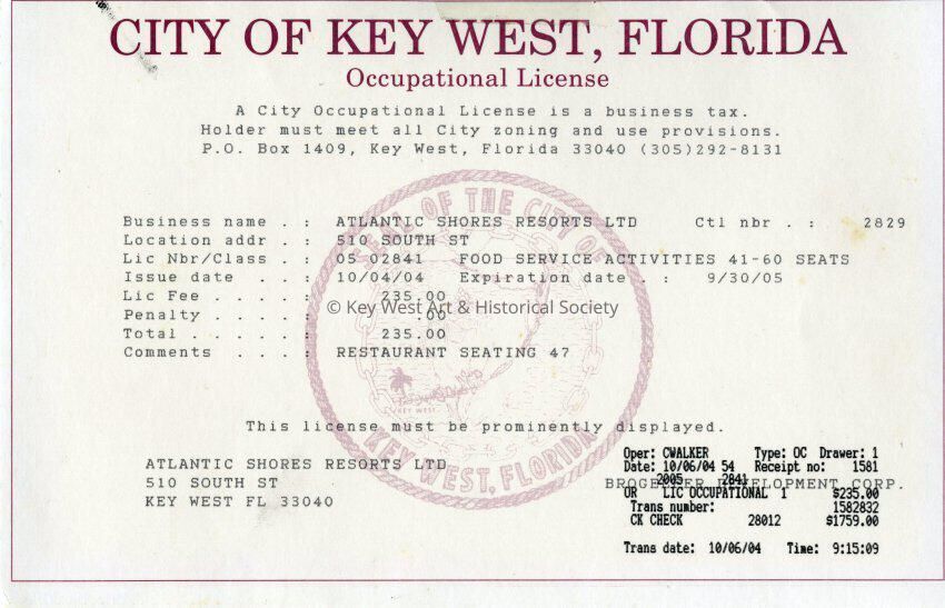 Occupational License for Atlantic Shores Resort at 510 South Street effective October 4, 2004, issued by the City of Key West.