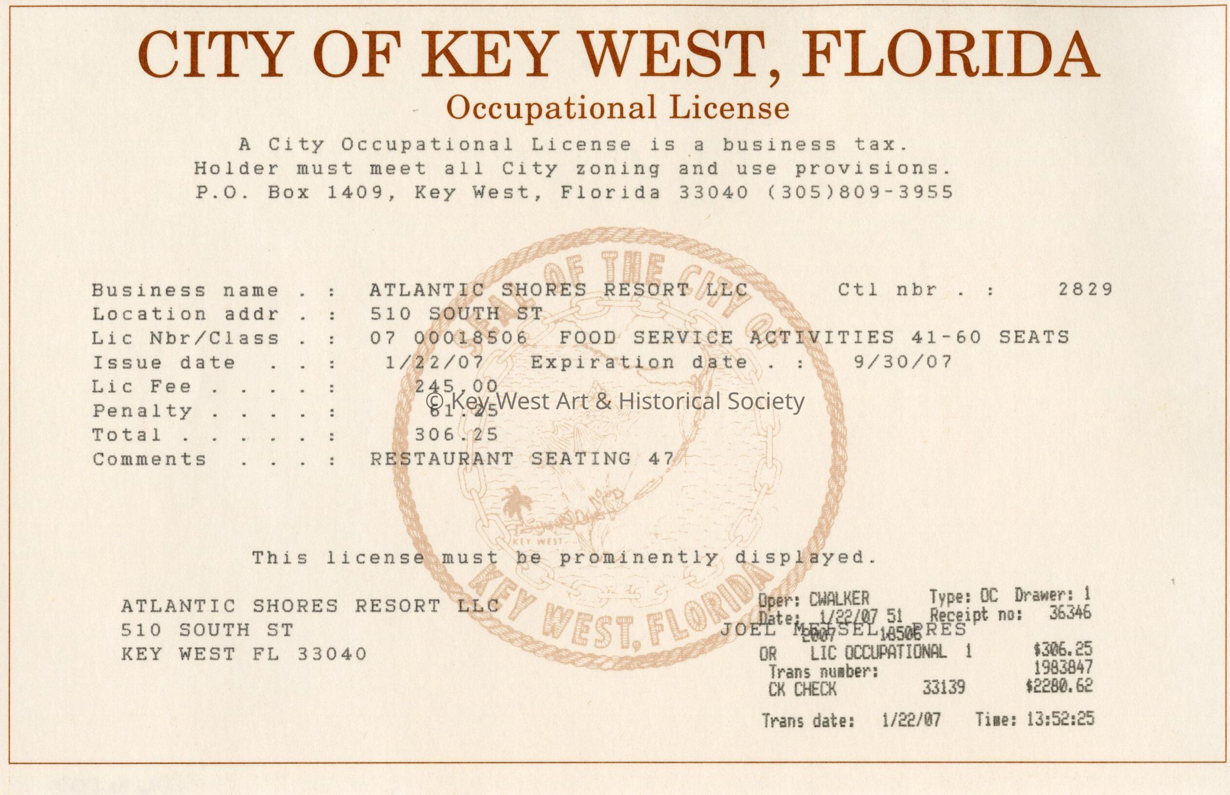 Occupational License for Atlantic Shores Resort at 510 South Street effective January 22, 2007, issued by the City of Key West.