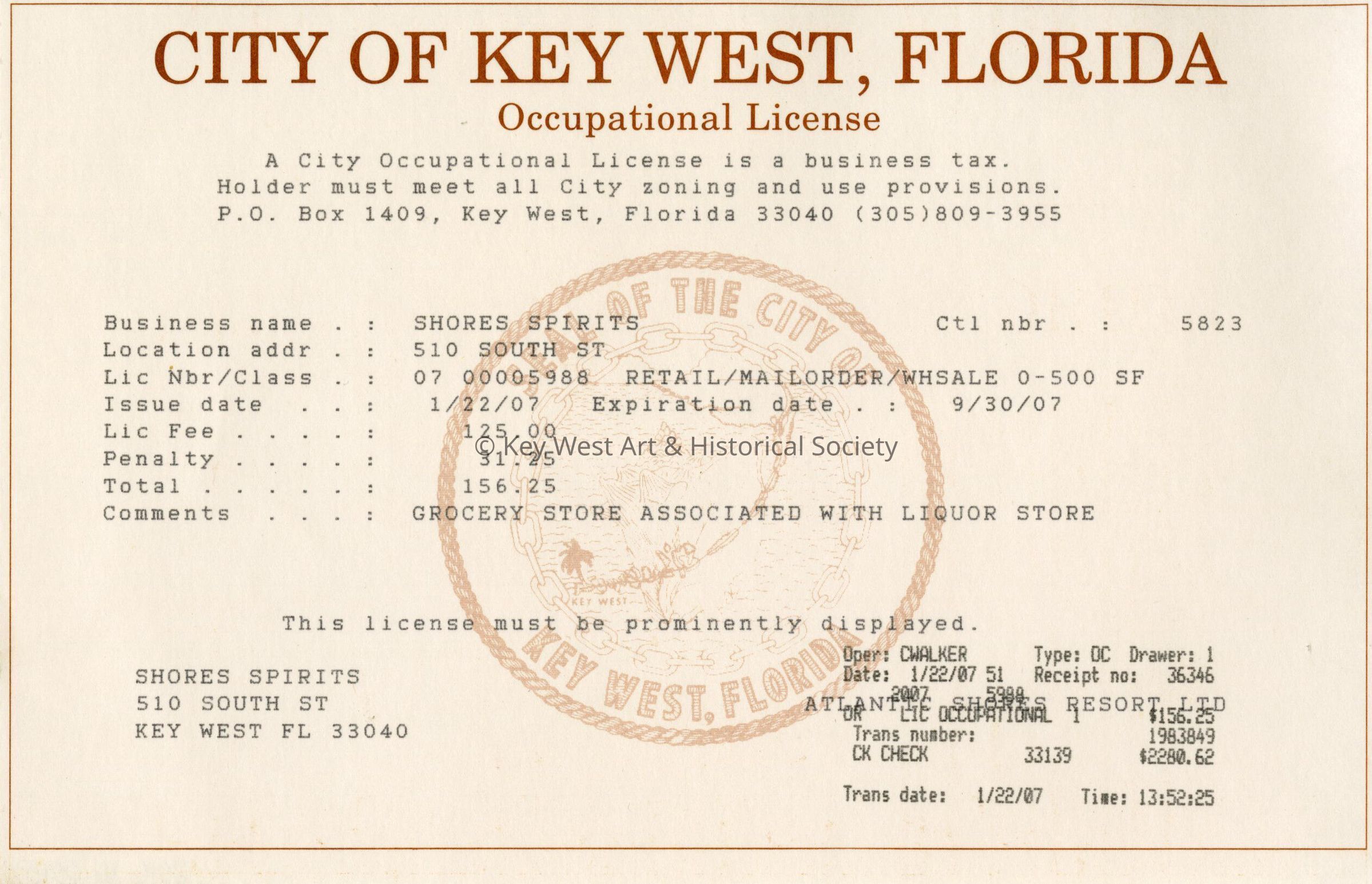 Occupational License for Shores Spirits at Atlantic Shores Resort at 510 South Street effective January 22, 2007, issued by the City of Key West.