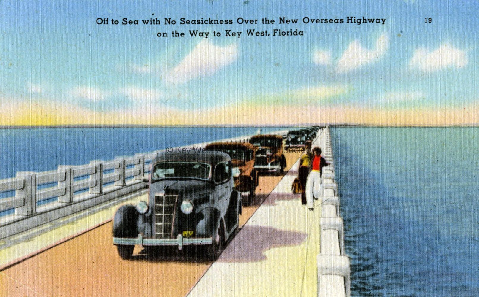 Postcard depicting cars and a couple crossing a long bridge. The caption reads, ‘Off to Sea with no seasickness over the new Overseas Highway on the way to Key West, Florida.’ The description on the verso reads, 'Stretching its silver-length across the blue waters of the Atlantic and the Gulf of Mexico, the new Overseas Highway connects Key West with the mainland. It is regarded as one of the engineering marvels of modern times.'Collection