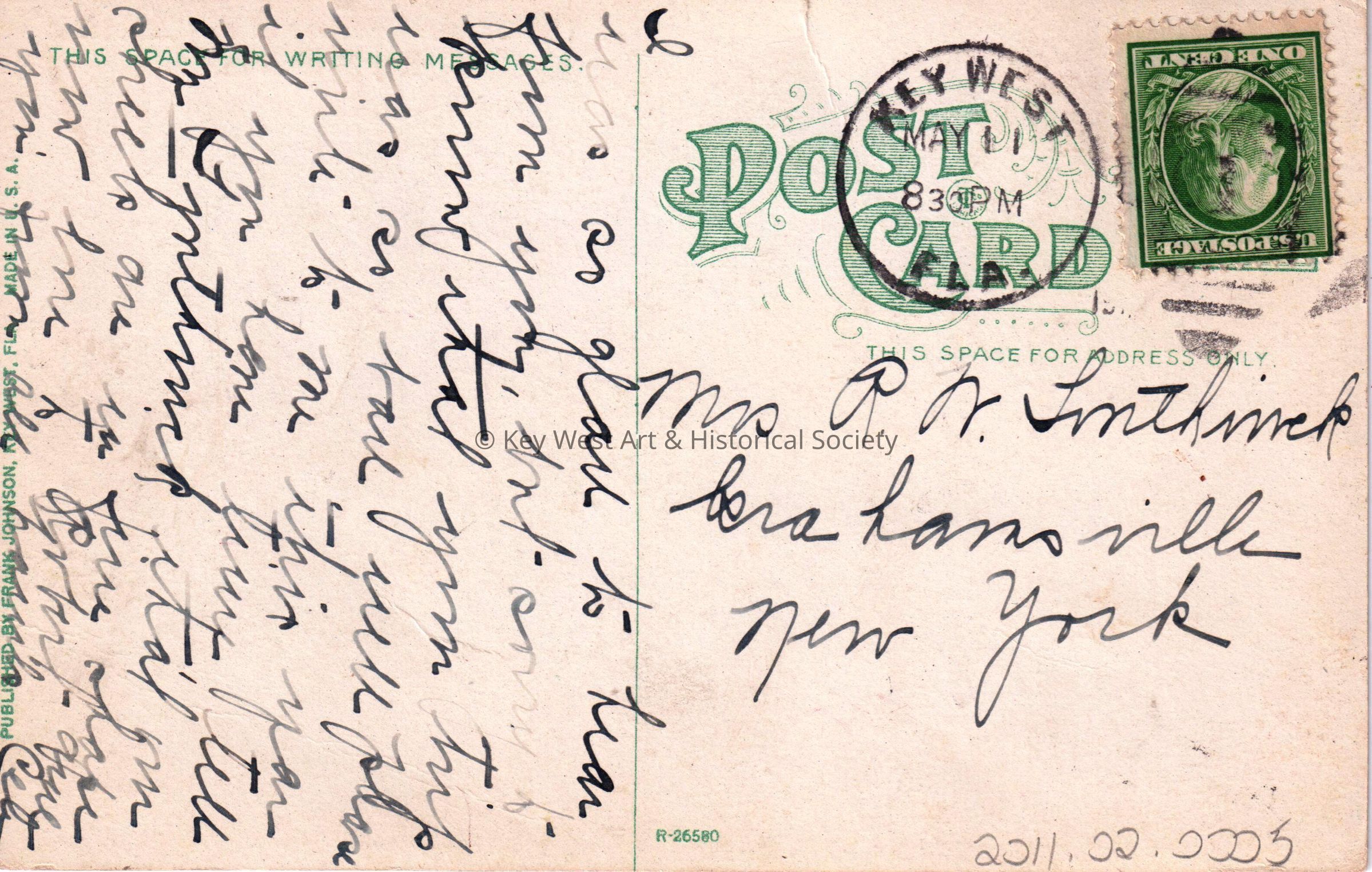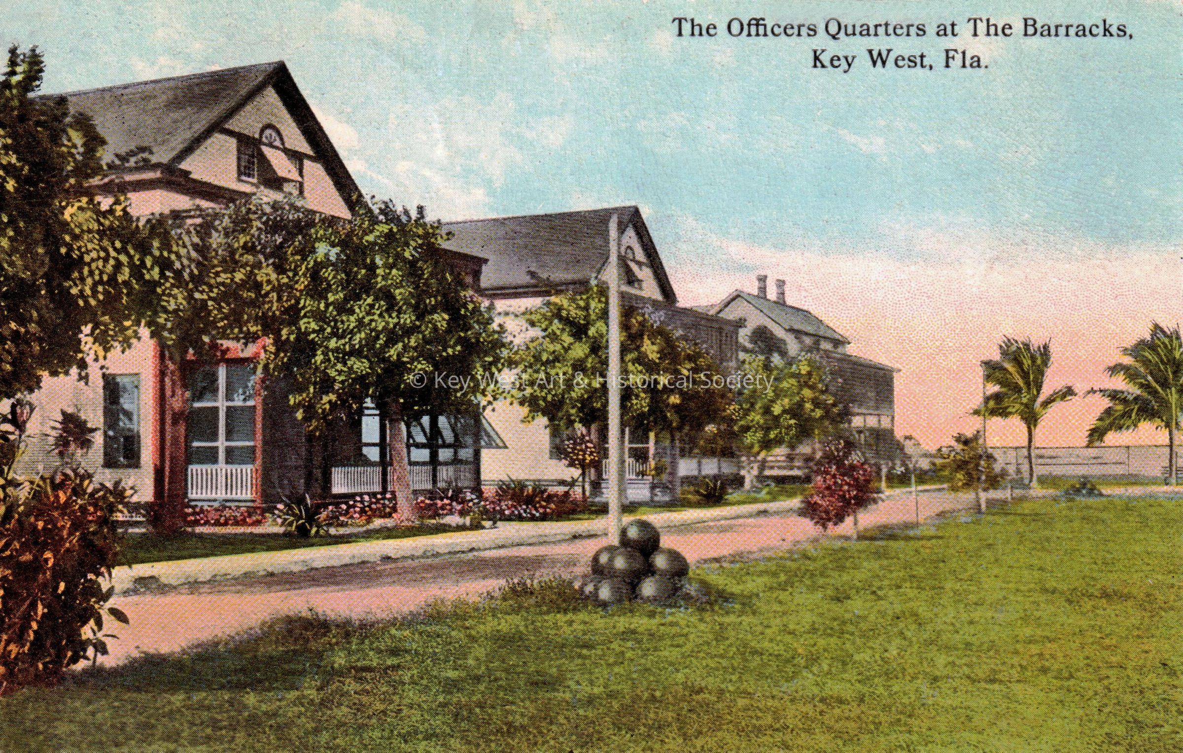 Postcard depicting cannon balls in front of houses. The caption reads, ‘The officers quarters at the barracks, Key West, Florida’. The message on the verso reads, ‘I was so glad to hear from you, but sorry to know that your trip was so bad. Well please write to me this year if you have time. Tell my ___ that our sheets are in fine shape now. Love to Robert ____.' The card is addressed to Mrs. R. N. Smithwick, Brahmsville, New York, and is postmarked Key West, May 11.Subject Place