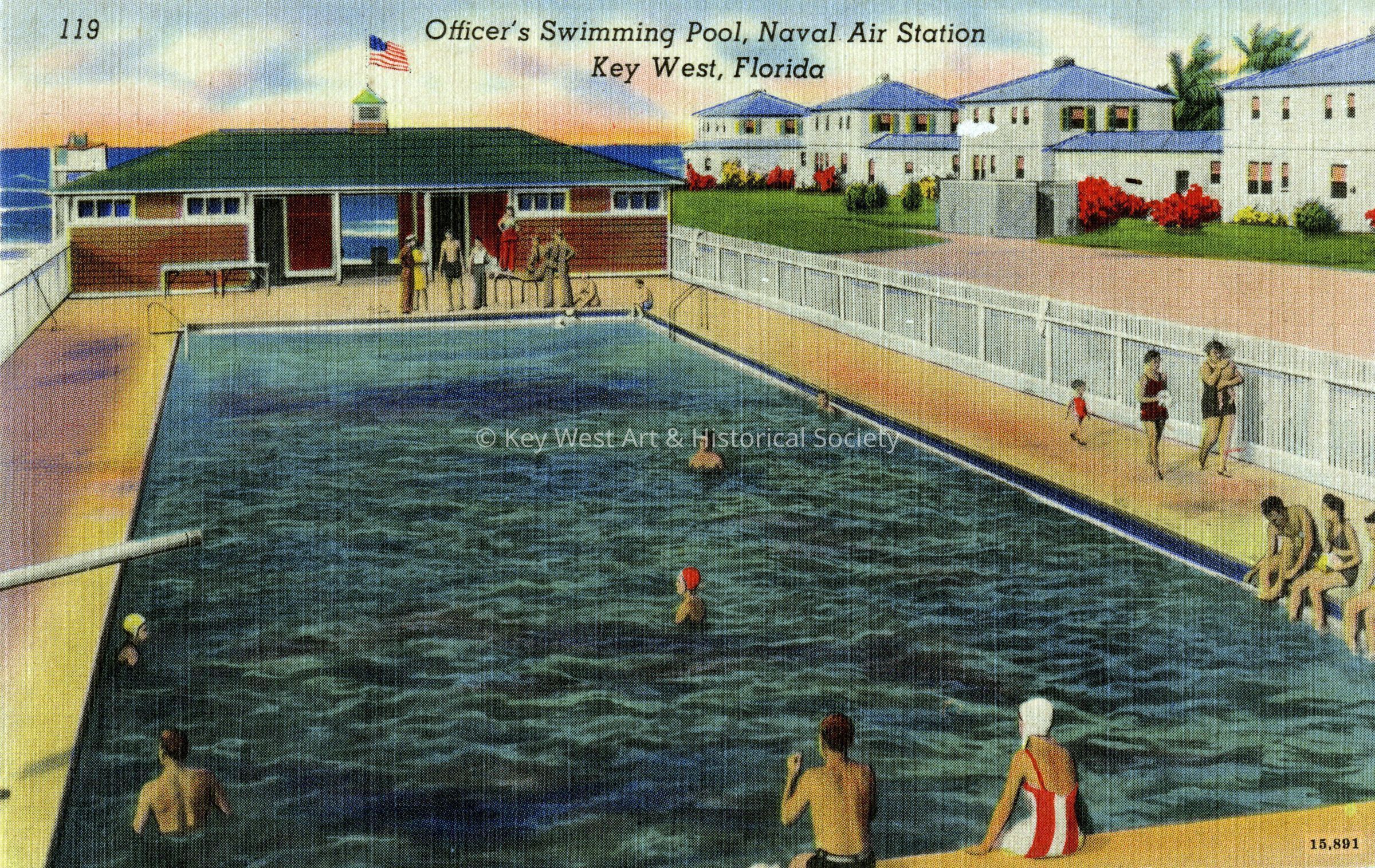 Postcard depicting people in the swimming pool at Naval Station Key West. The caption reads, ‘Officer's Swimming Pool, Naval Air Station Key West, Florida.'Subject Place