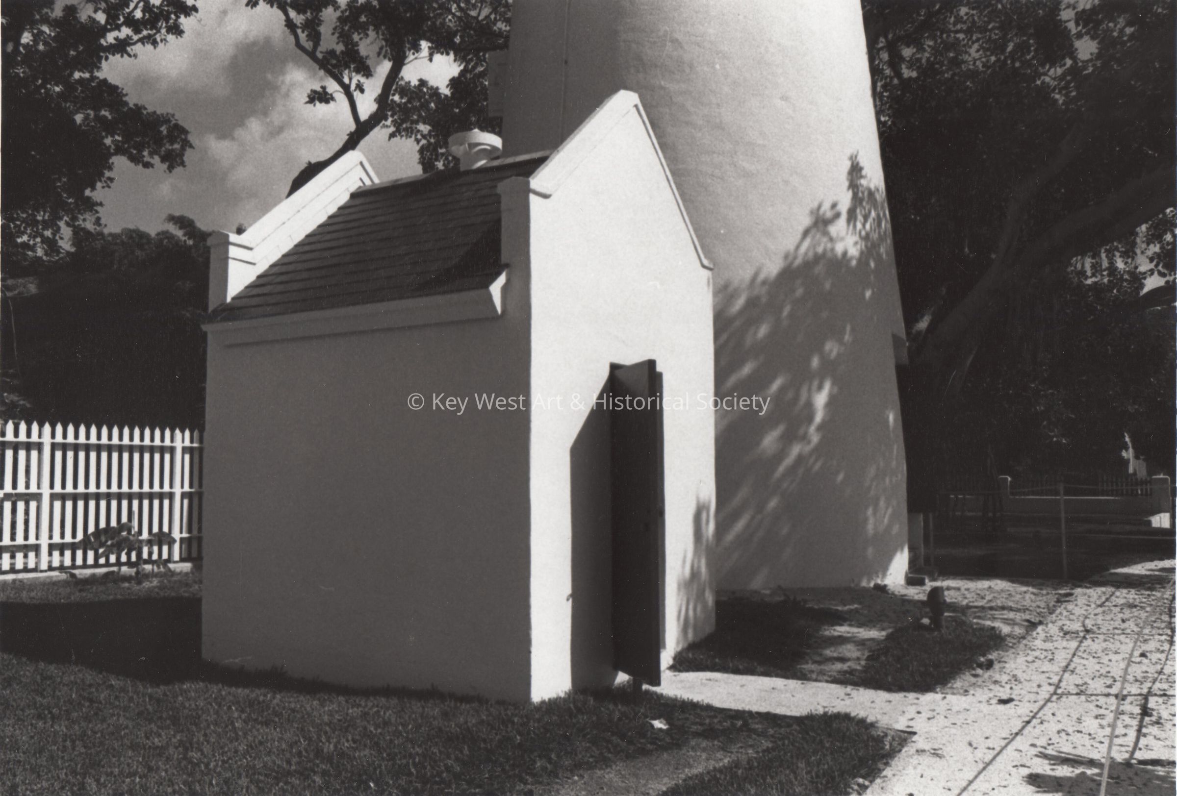 Black and white photograph of the oil house located at the base of Key West Lighthouse.