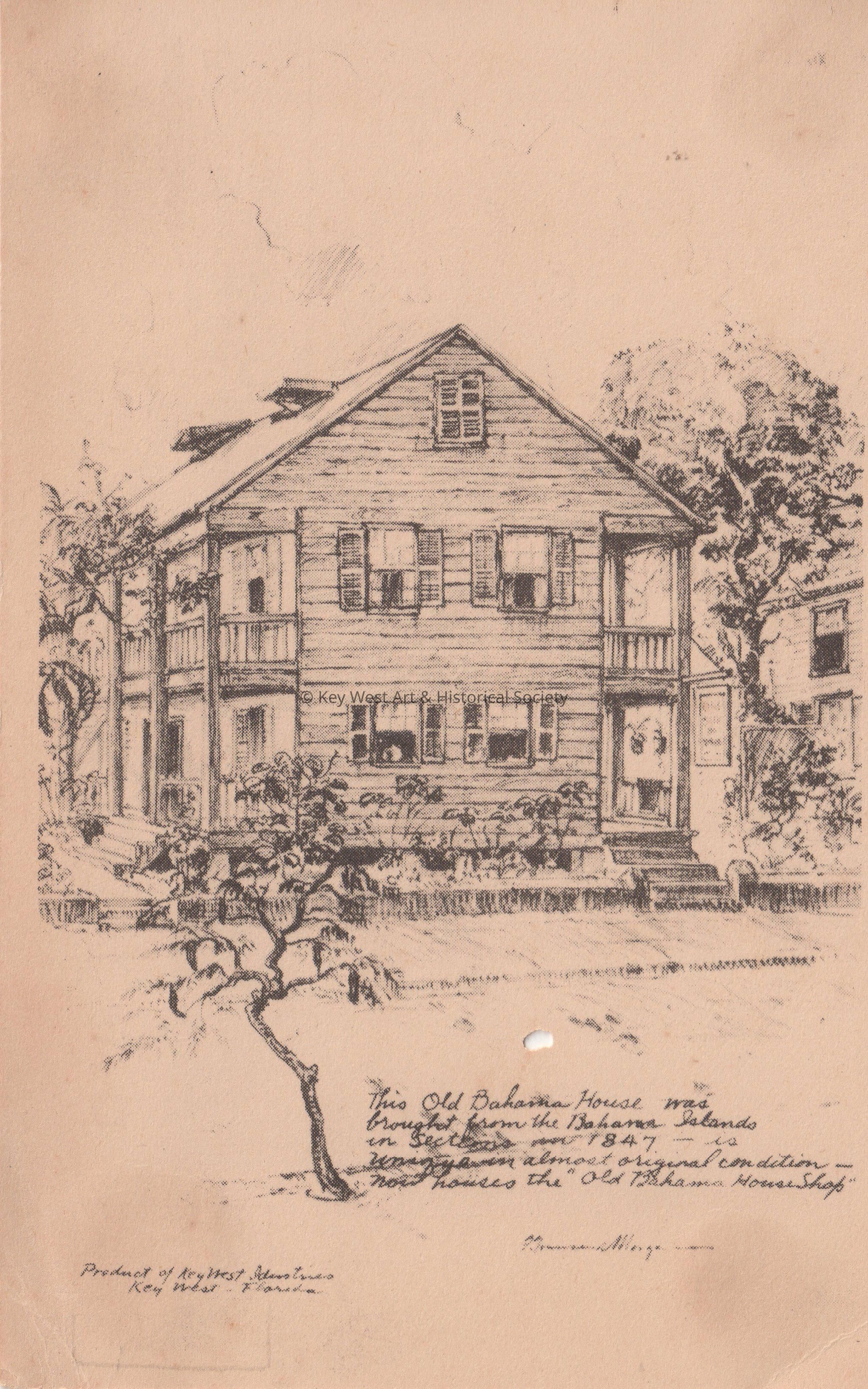 Postcard of a lithograph of a house and trees. The caption reads, ‘This Old Bahama House was brought from the Bahama Islands in sections in 1847 - is almost in original condition - now houses the “Old Bahama House Shop”’.Collection