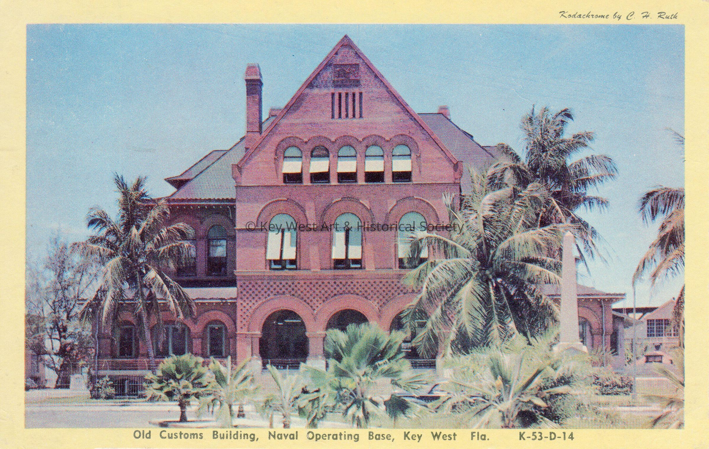 Postcard depicting the Key West Custom House and Post Office when it was used by the U.S. Navy. The caption reads, ‘Old Customs Building, Naval Operating Base, Key West, Fla’.Subject Place