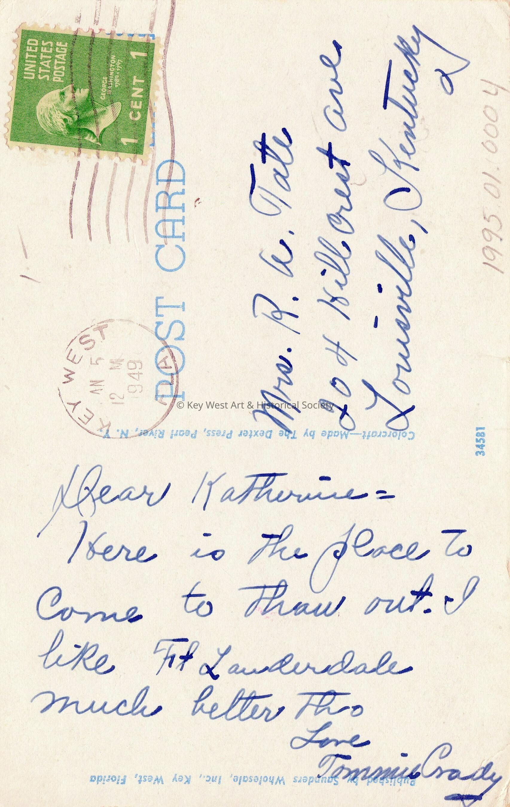 Dear Katherine, Here is the place to come to thaw out. I like Fort Lauderdale much better, though. Love, Tommie Crady.