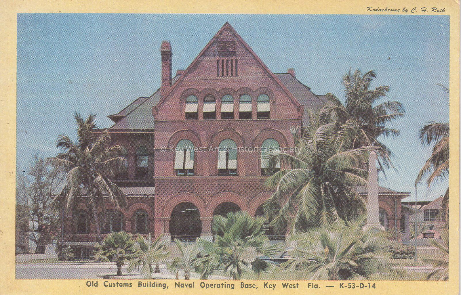 Postcard depicting the Key West Custom House and Post Office. The caption reads, ‘Customs Building, Naval Operating Base, Key West, Fla'.Subject Place