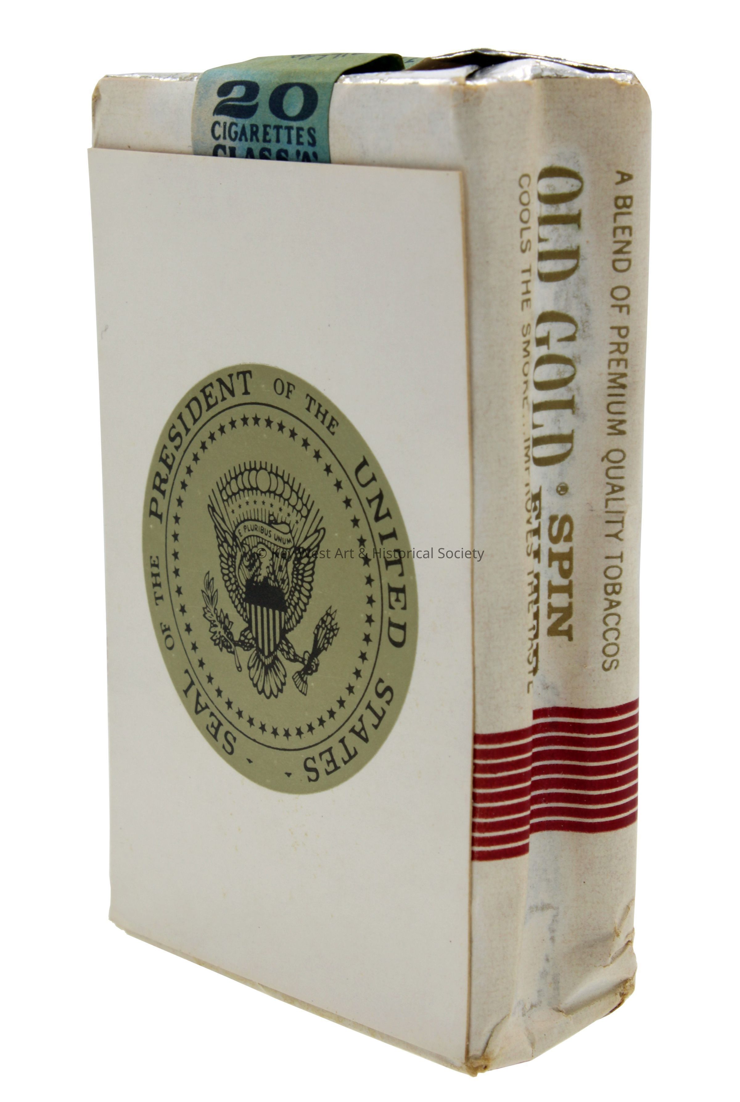 Pack of twenty Old Gold Brand cigarettes belonging to US President Harry S Truman. The presidential seal on the back of the unopened pack.